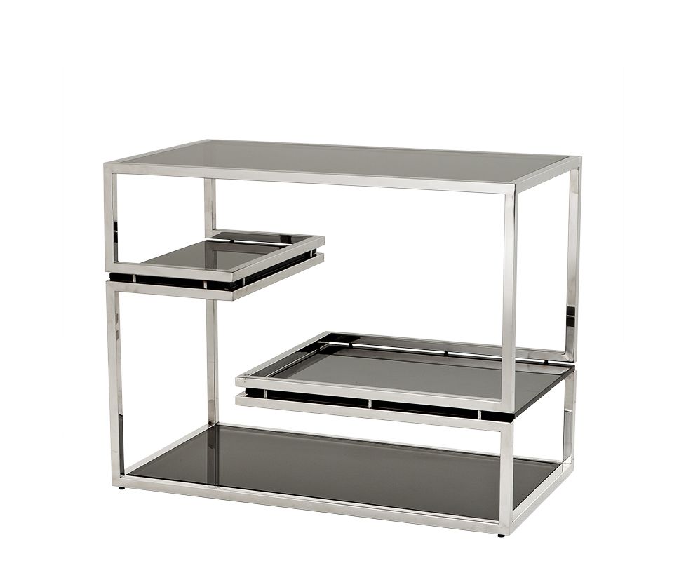 Приставной столик с тремя прямоугольными столешницами из черного стекла. Модель для современного интерьера. Три уровня расположения предметов: минимум затраченного пространства при максимуме функциональности.