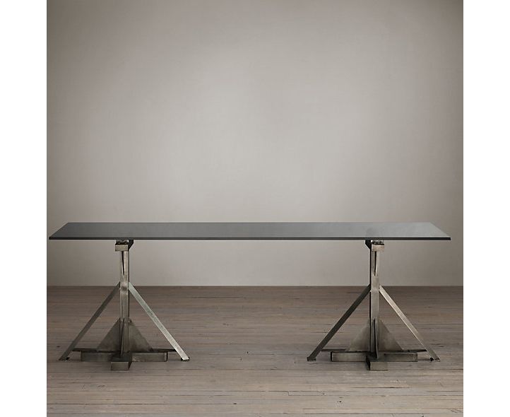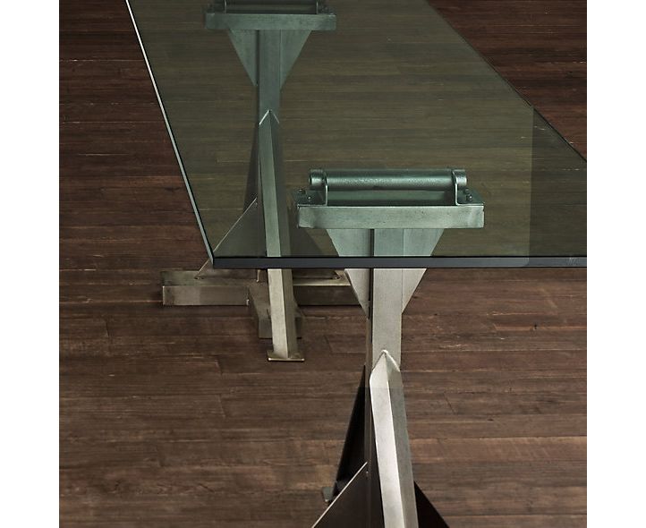 Каркас взят от моделей середины 20-го века, производимых американским заводом. Ножки поддерживают плиту из закаленного стекла, создающую столешницу, образуется стиль промышленности и изобретательности. Этот обеденный стол сделан из нержавеющей стали и сохраняет видимые швы отлично гормонирующие с просторами стекла столешницы.