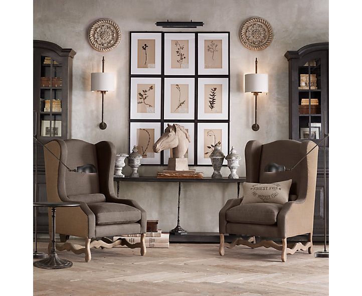Репродукция французского антиквариата 19-го века, мастера фабрики обновили классические крылья кресла с текстурной апелляцией. Мягкая обивка из бельгийского льна дополняется мешковиной на задней части и кантом. Кресло получило дух деревенской утонченности. Дубовые ножки с резьбой ручной работы придали стилю знаковости. В то время как обволакивающие крылья и глубокое сиденье обеспечивают комфорт.