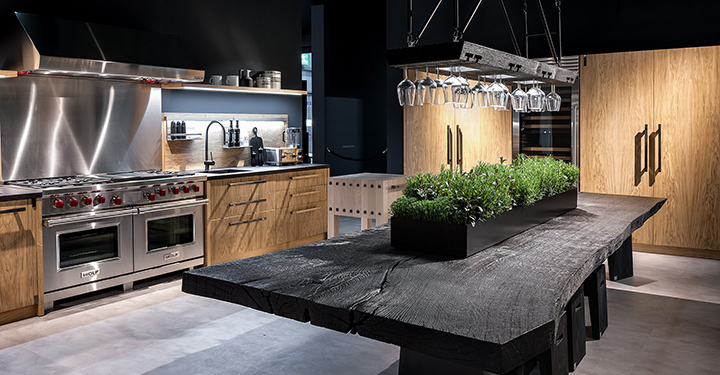 Кухня из цельного дерева и фанеры, полученная в результате сотрудничества с Dekton by Cosentino, Wolf и SubZero. Основная привлекательность в этом полупрофессиональном, крупногабаритном оборудовании - центральный остров, выполненный с консольной деревянной столешницей с железной основой, последняя из которых имеет специальную форму, содержащую ряд стульев, которые можно убрать и вытащить. Еще одной особенностью является структура выше с двойной функцией обеспечения освещения и хранения бокалов, света, отражающегося через стекло, чтобы создать соблазнительный эффект. Дополнительные элементы - это два блока, один из которых традиционный. У одного есть деревянная "головка" для работы с мясом, а другая - в «французском» стиле с ящиком и ножевым блоком, функционирующим как рабочий остров. Dekton - это сложная смесь из лучших материалов, используемых в производстве стекла, керамические материалы и кварц из качественного материала. Традиционные и высококачественные столярные изделия прекрасно сочетаются с современным оборудованием для приготовления горячей и холодной пищи (Wolf and SubZero); это кухня для тех, кто действительно любит культуру изысканной кухни и хорошую жизнь.