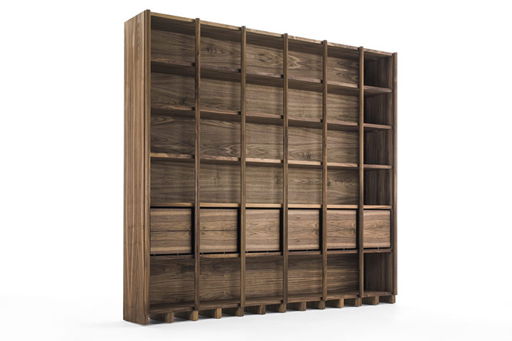 Книжный шкаф из массива древесины. Многослойная конструкция, характеризуется системой боковых и модульных стеллажей с плинтусом. Он может быть приспособлен в соответствии с различными требованиями к мебели, а также может поставляться с двойными дверями и выдвижными ящиками, оснащенными двухтактной системой открывания.