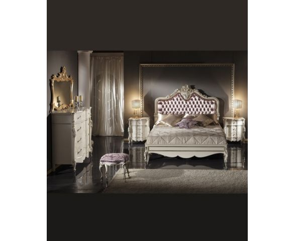 Мебельный гарнитур для спальни в стиле борокко. Каркас мебели выполнен из массива древесины. В гарнитур входит двуспальная кровать с высоким мягким изголовьем, две прикроватные тумбочки с выдвижными ящиками, комод с несколькими выдвижными ящиками, зеркало и пуфик. Все предметы оформлены в едином стиле и украшены изящными резными элементами ручной работы.