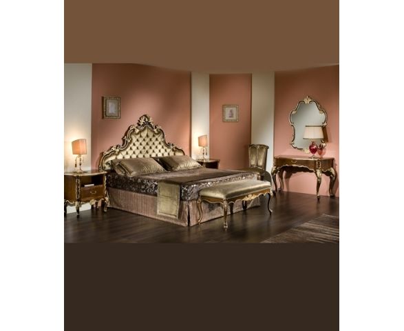 Мебельный гарнитур для спальни в стиле борокко. Каркас мебели выполнен из массива древесины. В гарнитур входит двуспальная кровать с высоким резным изголовьем, две прикроватные тумбочки с выдвижными ящиками, консоль с зеркалом, стул и банкетка. Все предметы оформлены в едином стиле и украшены изящными резными элементами ручной работы.