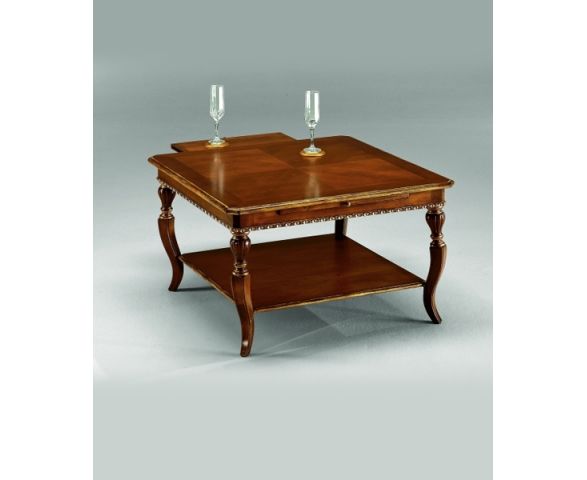 Кофейный столик квадратной формы. Изготовлен из массива древесины. На выбор предлагаются несколько вариантов отделки, которые можно выбрать из каталога фабрики. Квадратная столешница с лакированной поверхностью украшена тонкими вставками. Стол стоит на четырех фигурных утонченных ножках. Столешница имеет две выдвижных панели по бокам. И дополнительная столешница снизу.