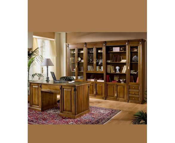 Мебельный гарнитур выполнен в классическом стиле без излишеств. Мебель изготовлена из массива древесины. В гарнитур входит стенка с несколькими шкафами и письменный стол. Шкафы имеют открытые и закрытые полки в верхней части за стеклянными дверцами, внизу за деревянными, а также выдвижные ящики. Все предметы, входящие в состав гарнитура украшены одинаковыми элементами.