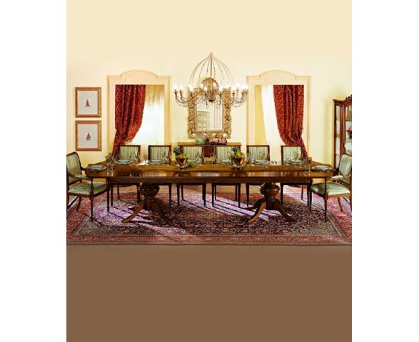 Великолепный стол в классическом стиле. Каркас изготовлен из массива древесины. На выбор предлагаются несколько вариантов отделки, которые можно выбрать из каталога фабрики. Прямоугольная столешница с лакированной поверхностью. Стол на двух фигурных ножках - крестовинах. Присутствует декоративная резная отделка.