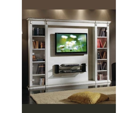Стеллаж под телевизор с вместительными полками. В центре организована большая ниша, в которой размещается телевизор и есть полка для другой техники или мелких предметов. По бокам имеются два книжных шкафа. Каркас изготовлен из массива древесины. Предлагается несколько вариантов отделки на выбор из коллекции фабрики.