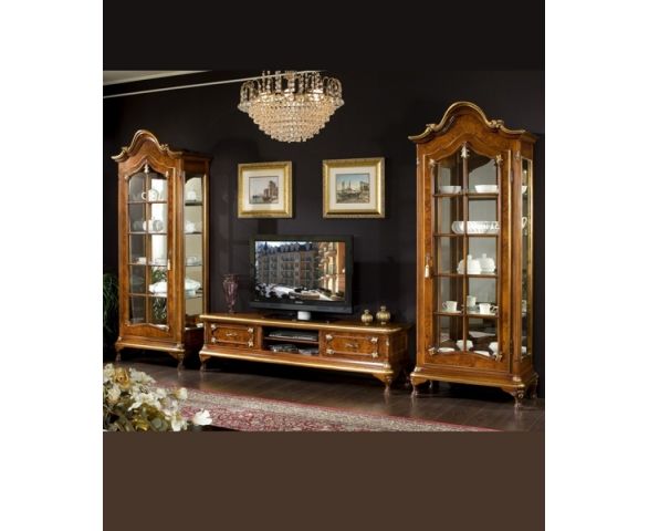 Мебельный гарнитур под телевизор с вместительными полками. Гарнитур состоит из двух витрин с несколькими полками, закрытыми стеклянной дверцей на ключе и центральной частью - тумбочка под телевизор с полками и нишами. Все предметы являются самостоятельными частями и могут быть использованы по отдельности. Гарнитур выполнен из массива древесины. В качестве декоративной отделки используются резные элементы ручной работы. Мебель стоит на ножках кабриоли. Гарнитур выполнен в классическом стиле.