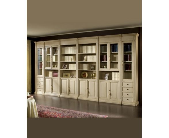 Вместительная стенка, состоящая из нескольких книжных шкафов. Каркас изготовлен из массива древесины. В коллекции фабрики представлены несколько вариантов отделок, которые можно выбрать. В стенку входят открытые и закрытые полки.