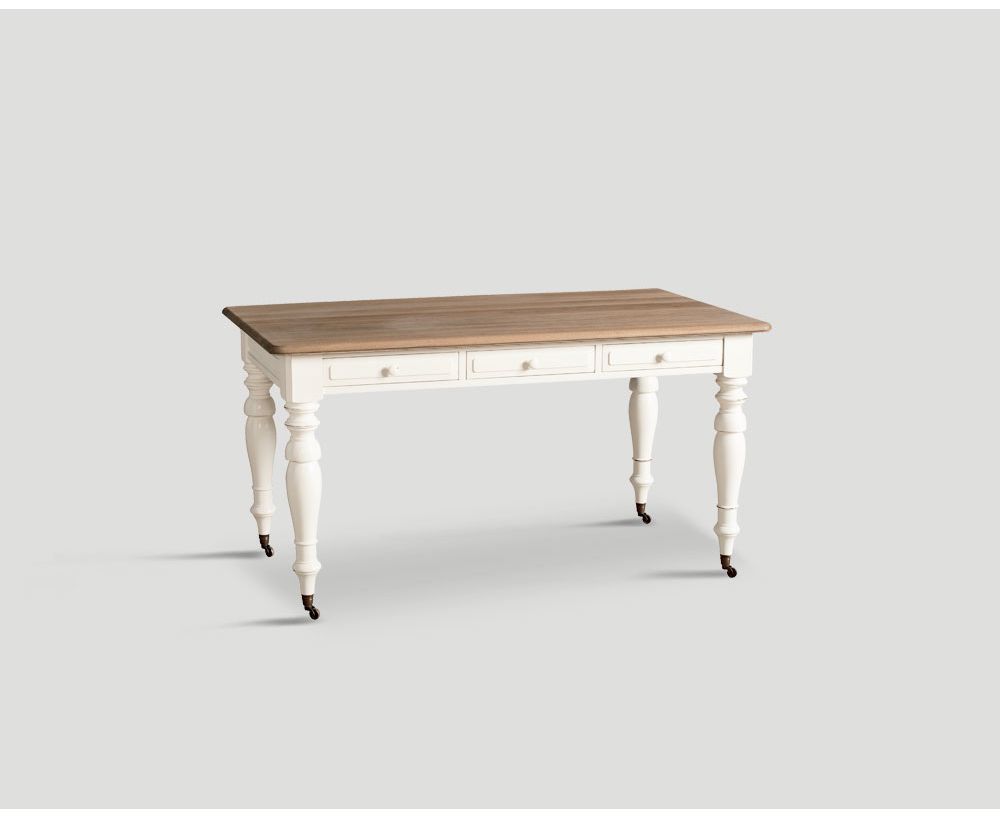 Scrittoio realizzato in legno di rovere con top naturale e base bianca, dotato di tre cassetti nella parte frontale e ruote in metallo