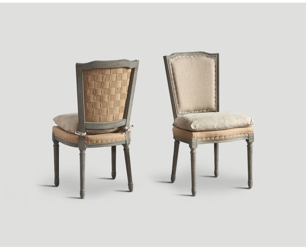 Sedia con struttura in rovere finitura decapata polverizzata con rivestimento in juta inchiodata e schienale intrecciato, seduta con cuscino in tessuto di lino color écru