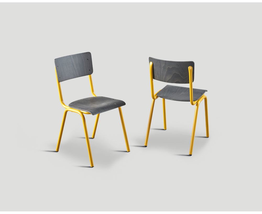 Sedia impilabile con struttura in metallo, seduta e schienale in faggio Vintage, struttura laccata Giallo seduta e schienale Nero Vintage