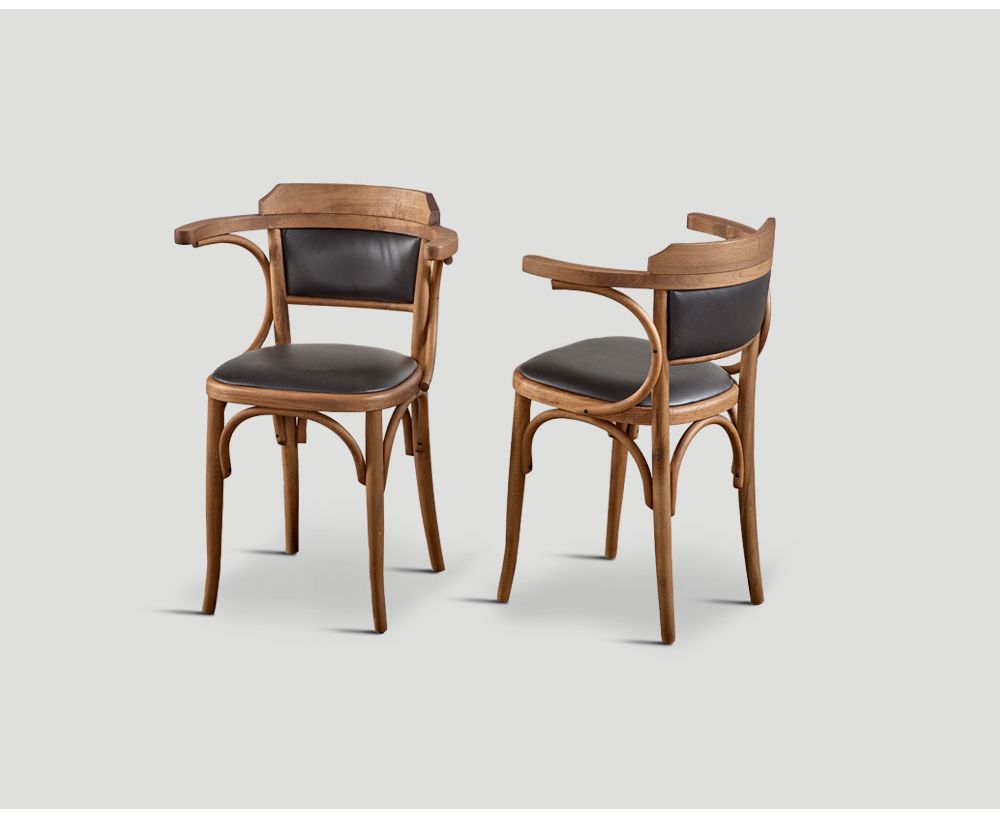 Sedia con braccioli e struttura curvata, finitura Legno Vintage, sedile e schienale ecopelle Testa di Moro