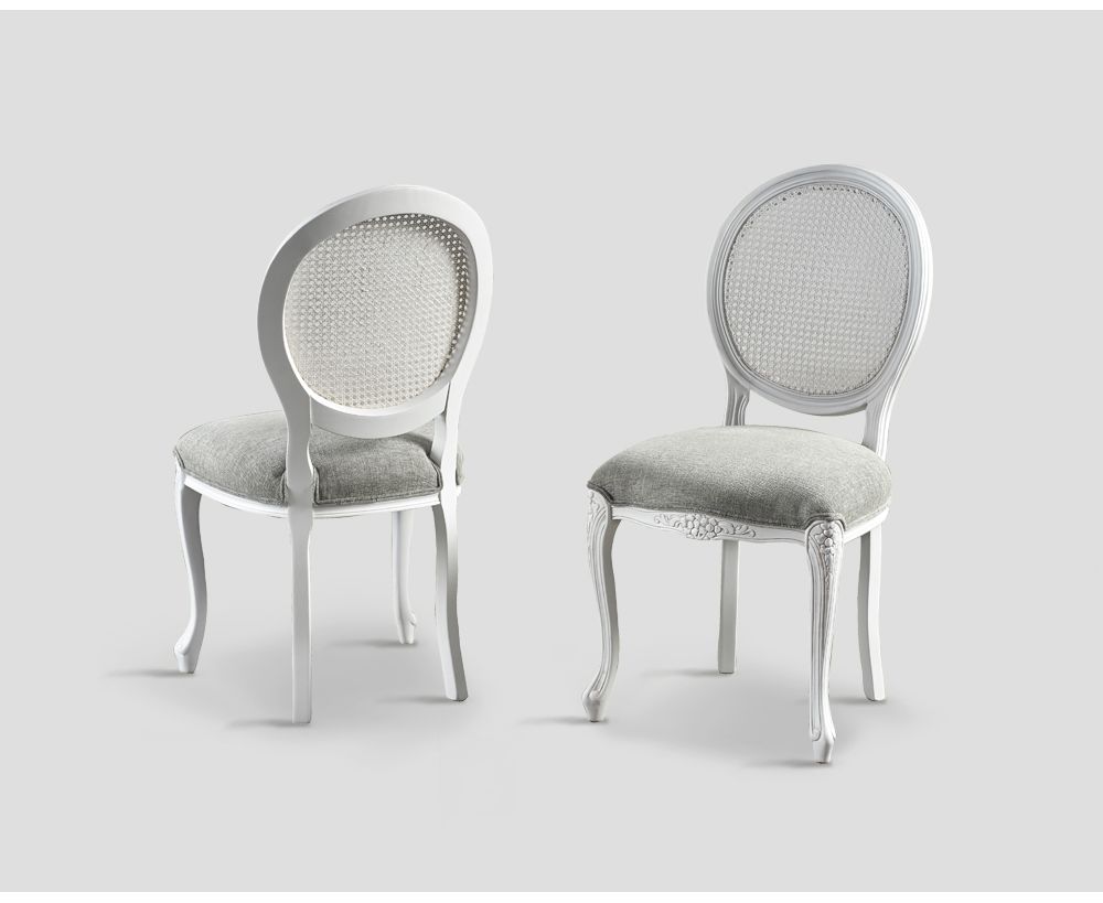 Sedia con struttura in faggio, rivestimento in tessuto e schienale in paglia di Vienna, finitura laccata Bianco Vissuto, tessuto color Polvere
