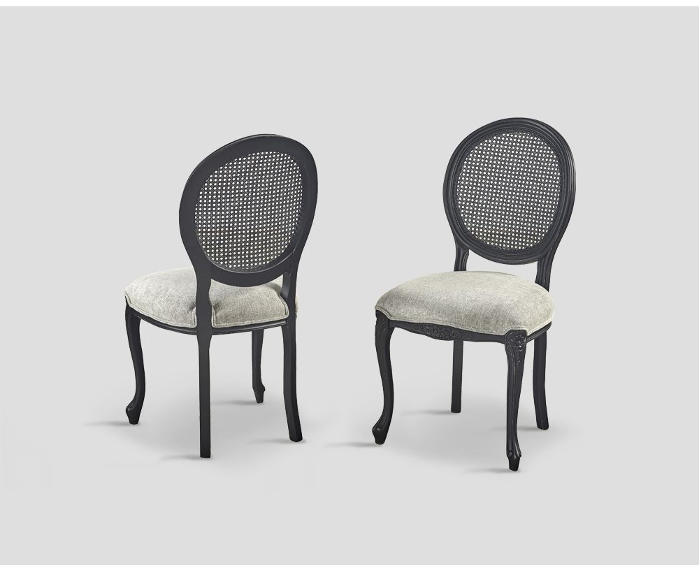 Sedia con struttura in faggio, rivestimento in tessuto e schienale in paglia di Vienna, Finitura laccata Nero Vissuto, tessuto color Polvere