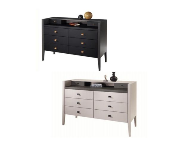 Комод с двумя маленькими и шестью большими ящиками, оборудованными самозакрывающимся механизмом. Одна открытая вишня выполнена из шпона вишни. Передние панели верхних ящиков отделаны кожей. Возможна отделка кожей столешницы и нижних ящиков. Декоратиная фурнитура предоставляется на выбор в коже или лаке.