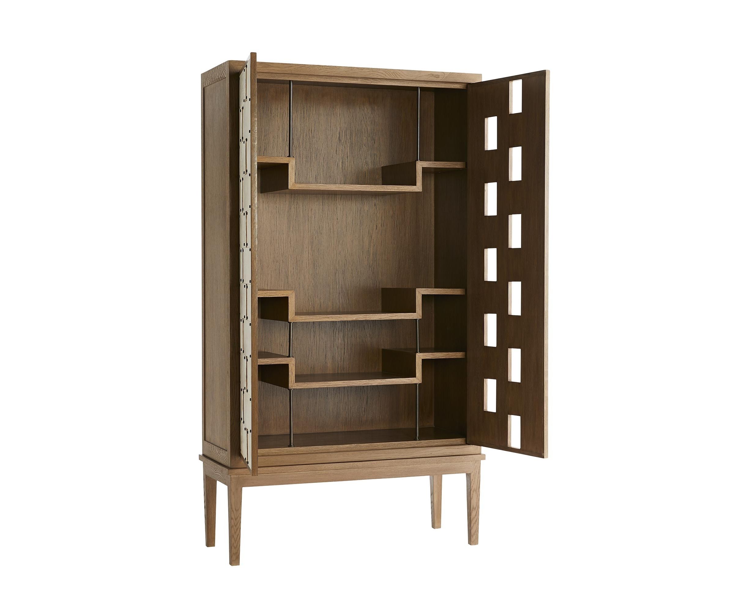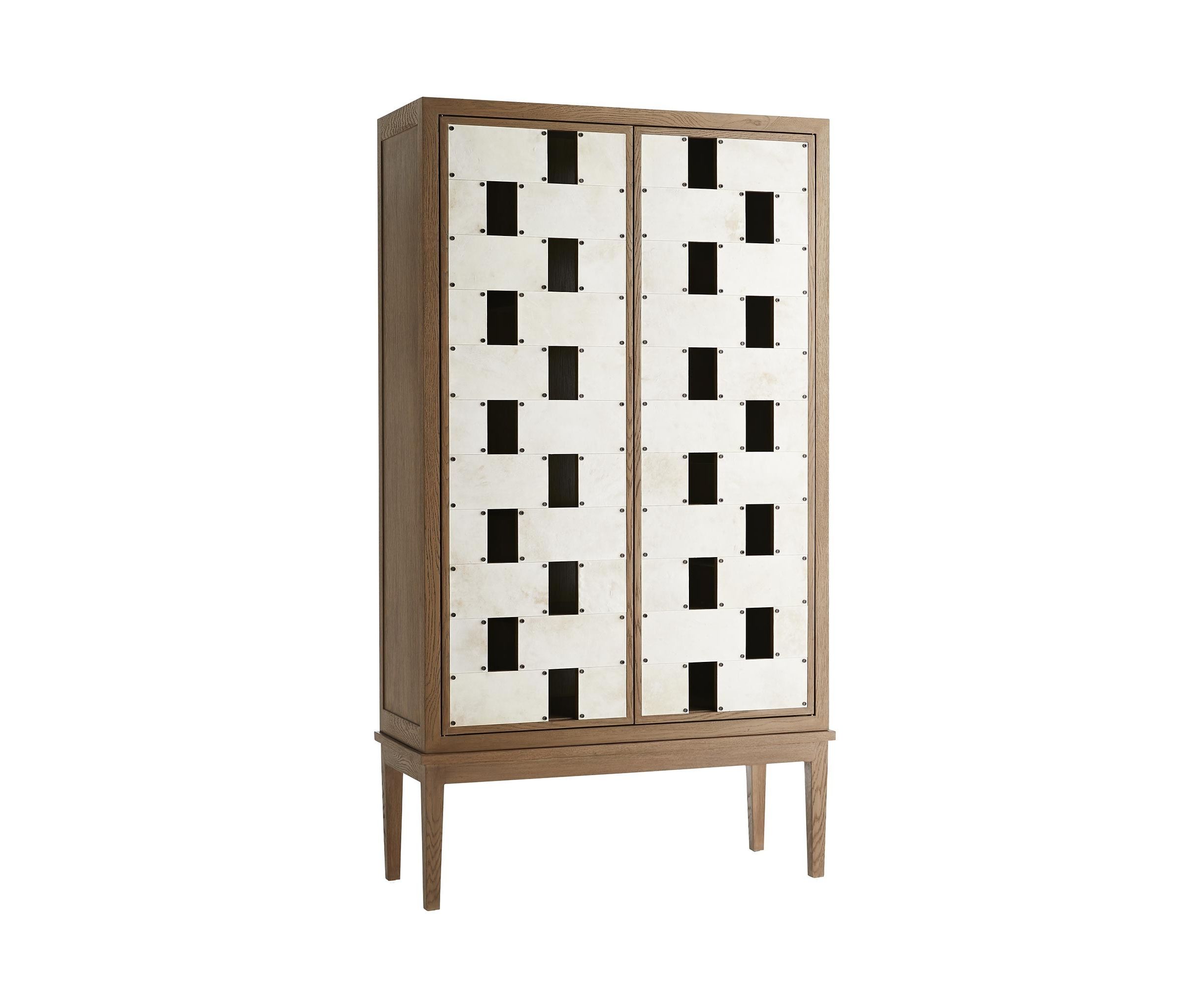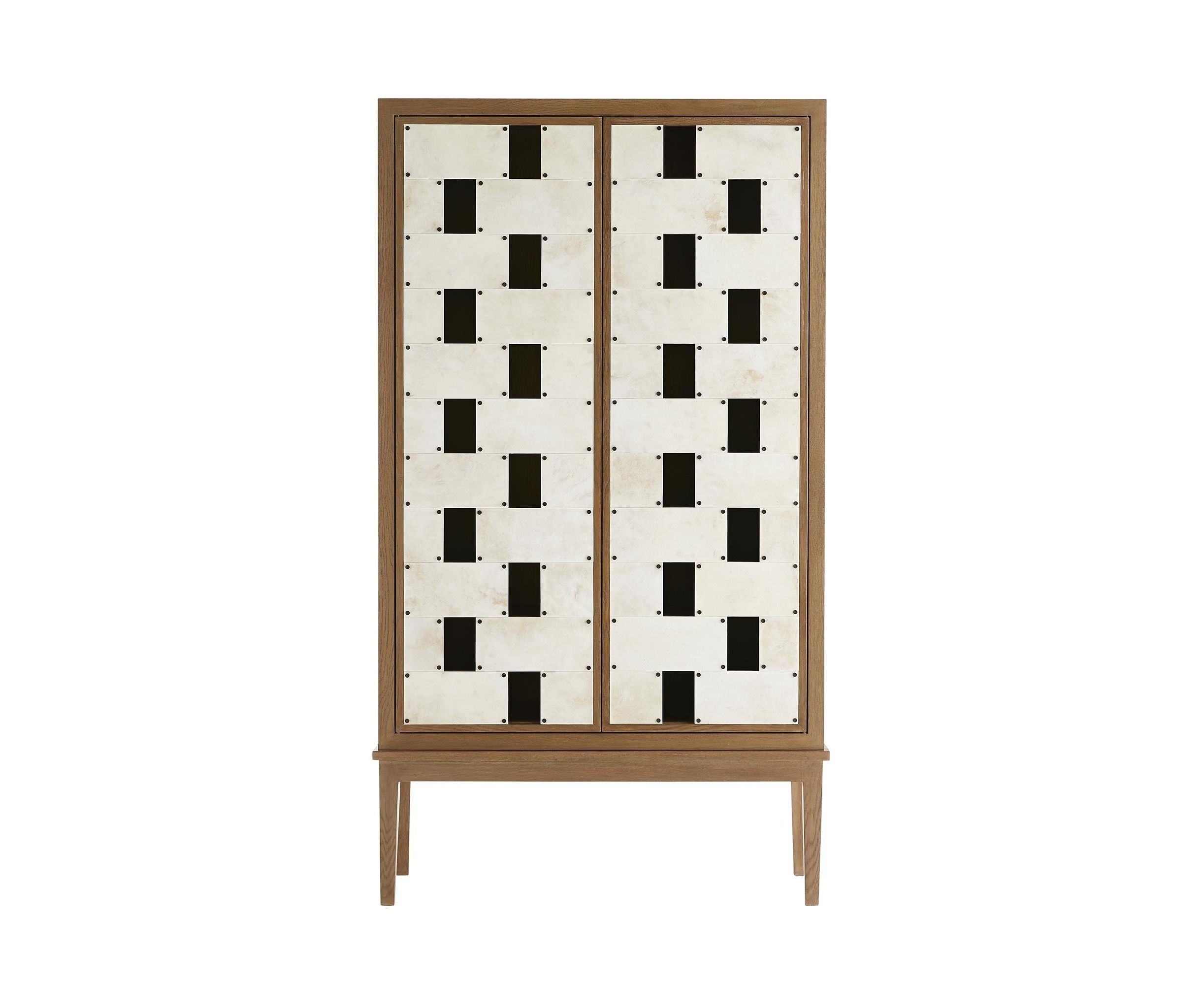 Шкаф Salotto Cabinet Фрэнка Понтерио, украшенный мелкими деталями, является жемчужиной его дебютной коллекции. Панно из слоновой кости было вдохновлено парой бронзовых дверей на вилле Некки в Милане. Первоначально разработанные для направления воздуха, переосмысленные вырезы являются чисто декоративными, предлагая представление о красиво-слоистом содержимом внутри. Светлый дуб и бронзовая фурнитура добавляют еще один слой мастерства.