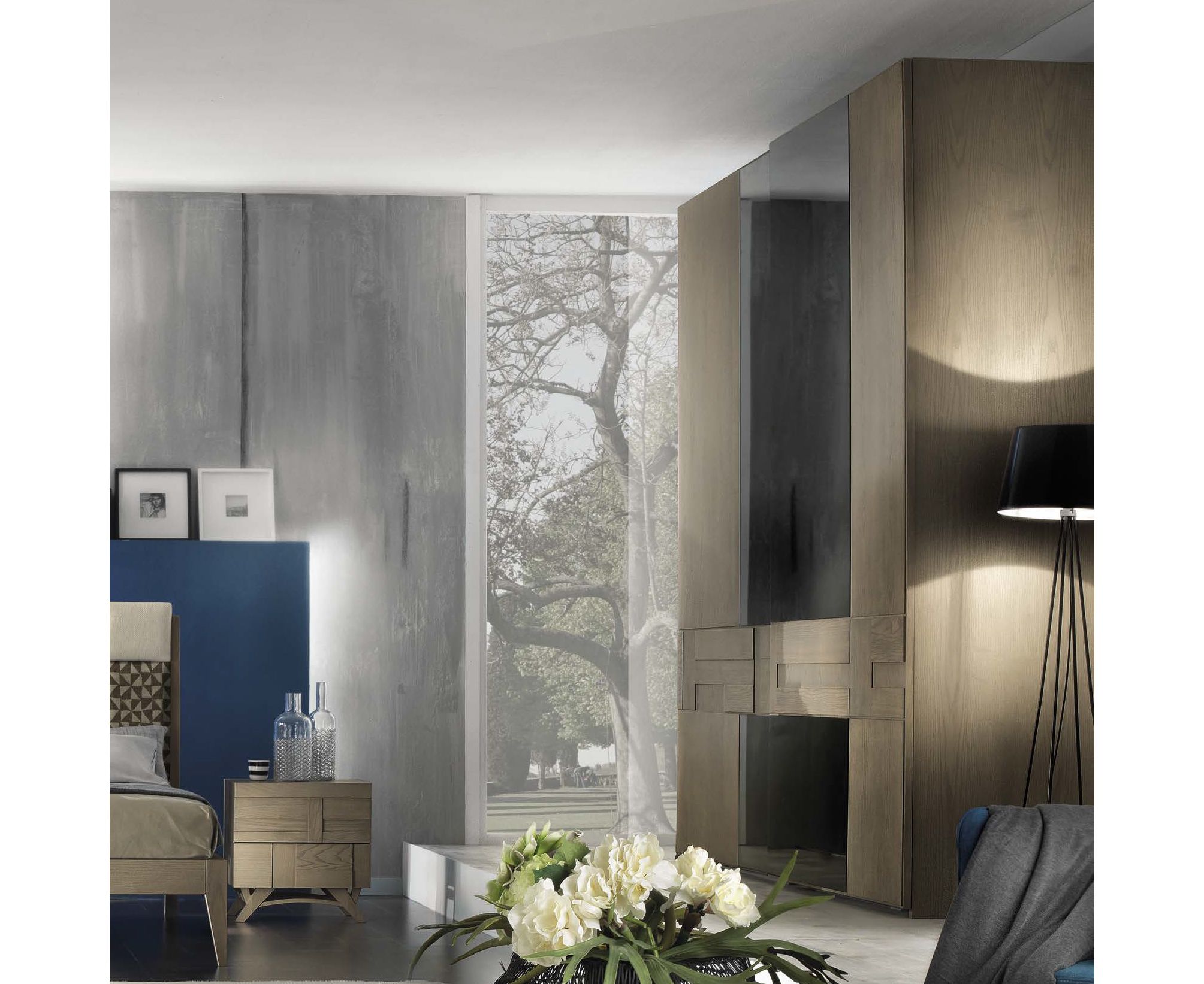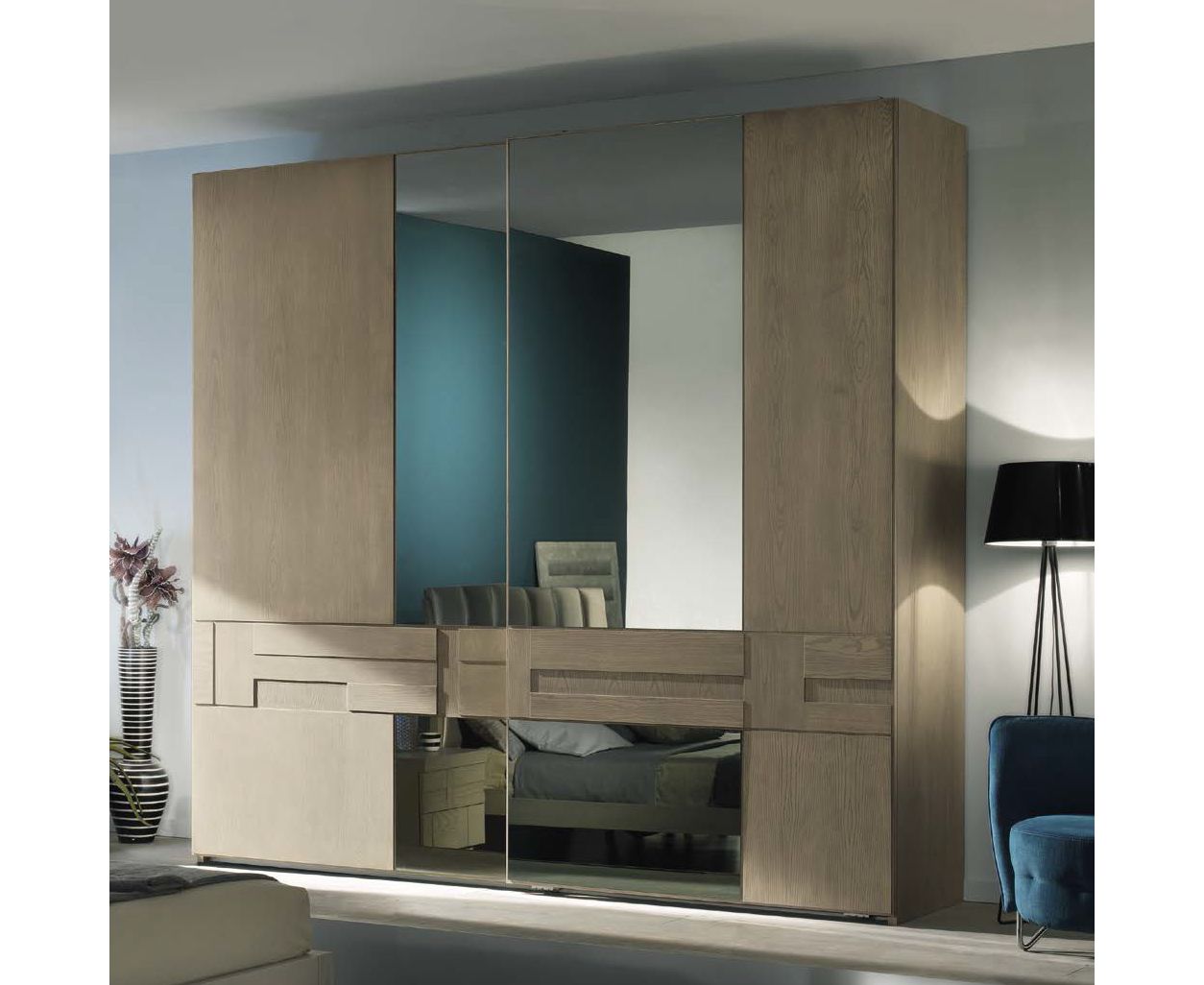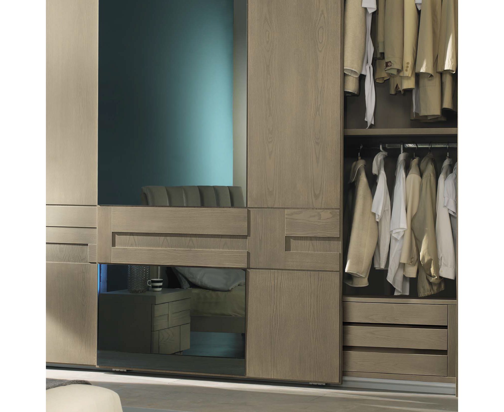 Шкаф с 2 раздвижными дверцами с зеркальным покрытием, а также декором из бежевой ткани и ткани с геометрической текстурой.