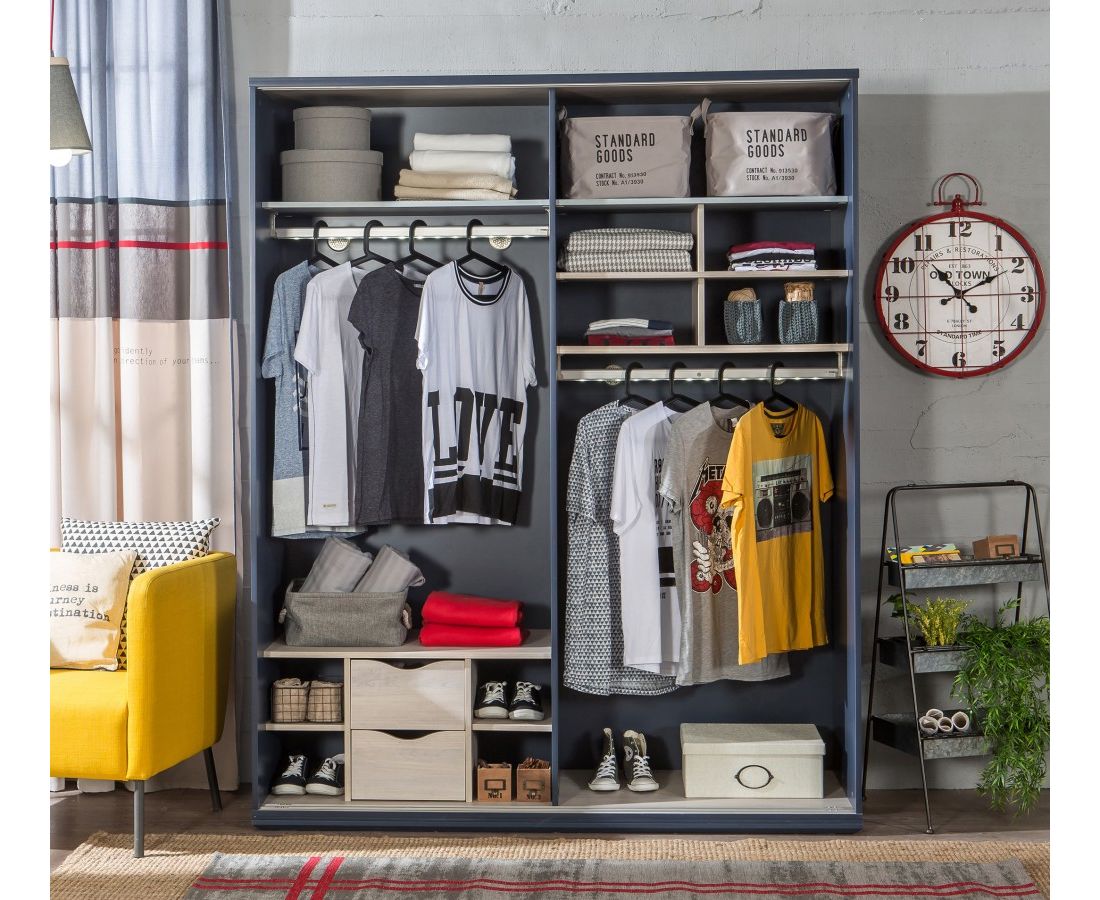Надежная система развижных дверей. Ящики и большое количество полок. Вешалка с подсветкой.
