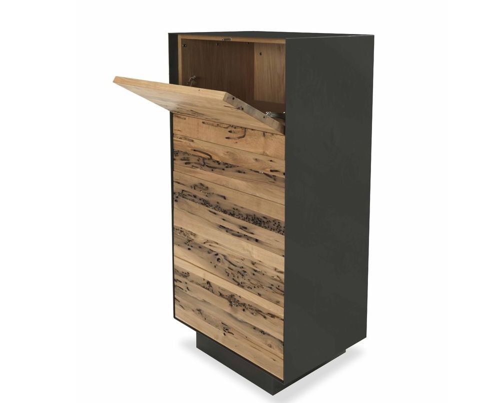 Комод из лиственных пород и фанеры, окруженный железной или деревянной рамой с распашными дверцами или ящиками, собранными с помощью шип-шарнирного соединения и системой выталкивания.