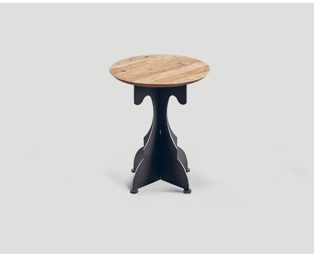 Round occasional table in recycled old wood, metal base with Ferro Brunito finish, top in solid wood with Naturale finish