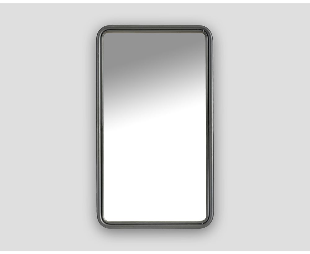 Specchio rettangolare con angoli smussati, struttura in metallo finitura ferro brunito.