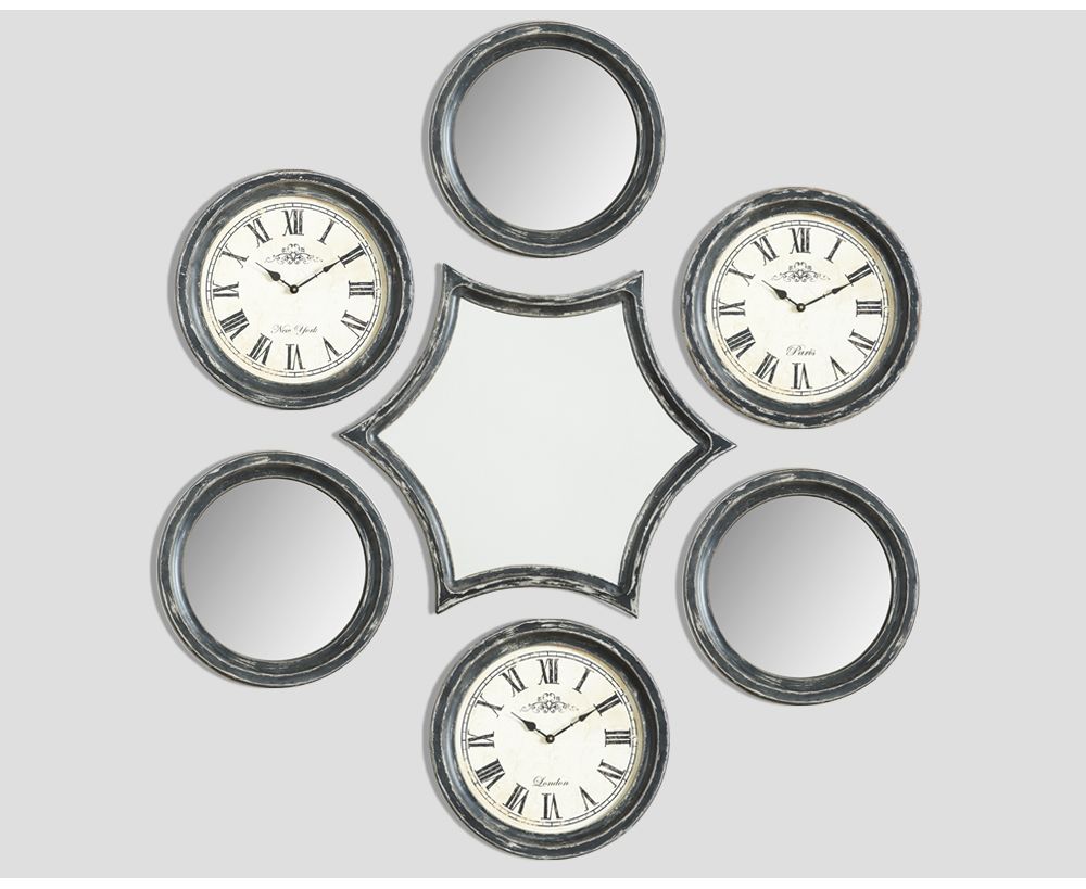 Set 7 pezzi. 3 specchi tondi + 1 specchio centrale + 3 orologi, in legno finitura laccato Nero decapato