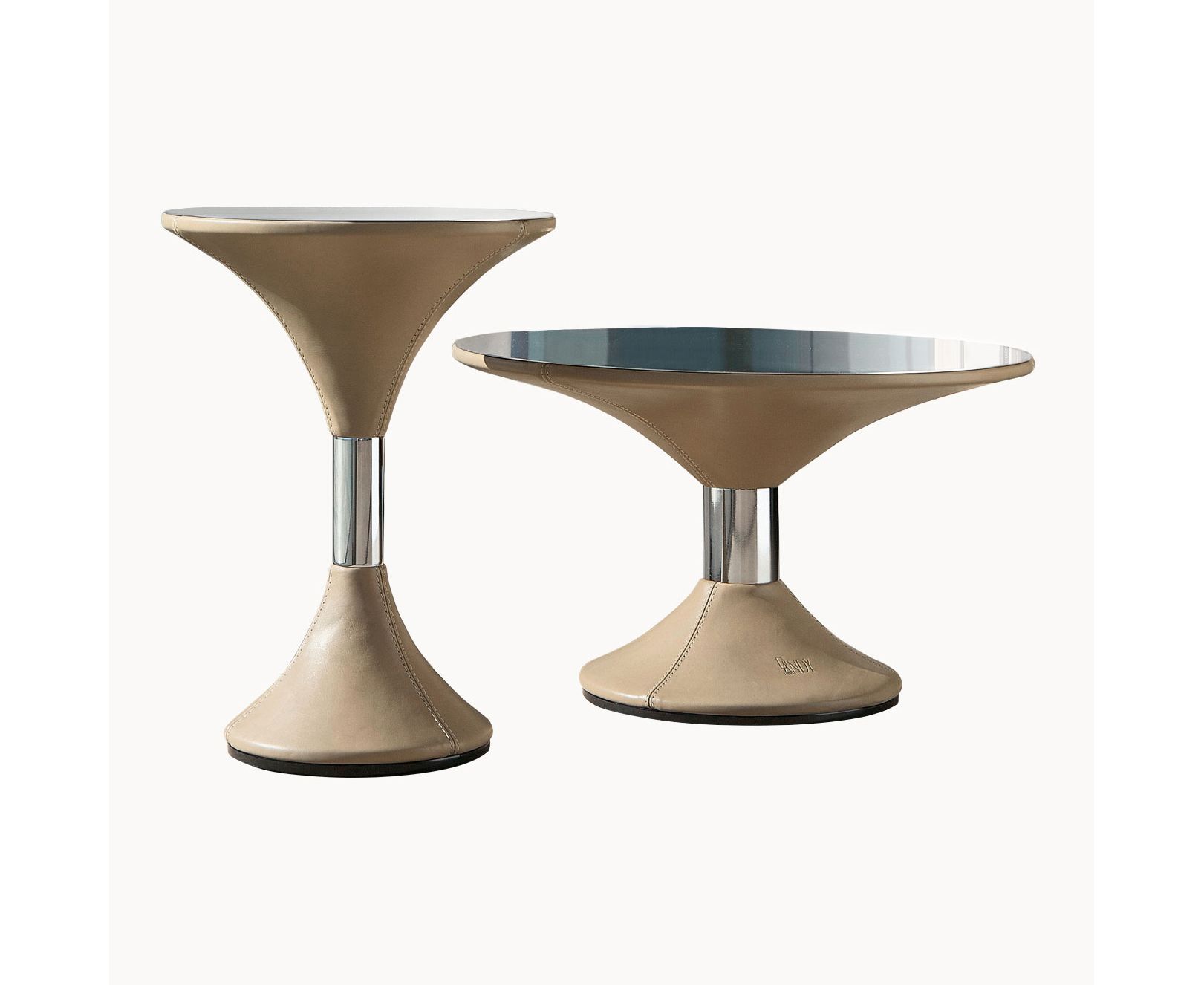 Основание из полиуретана, обшито кожей. Вставки из хромированного металла или металла, окрашенного в цвет по выбору. Столешница из стали.