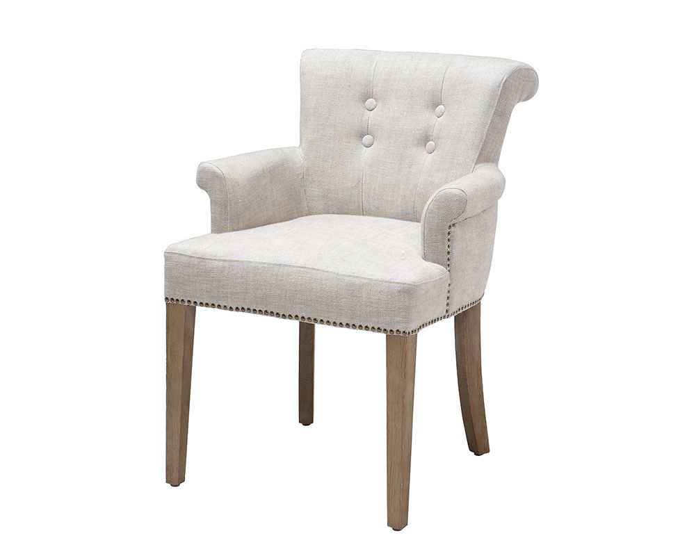 Мягкий стул с подлокотниками в современном классическом стиле. Отлично подойдет к любому интерьеру. Мягкие и плавные линии. Невысокая спинка слегка закруглена сверху и украшена четырьмя пуговицами. Сзади на ней имеется декоративное кольцо. Деревянные ножки.