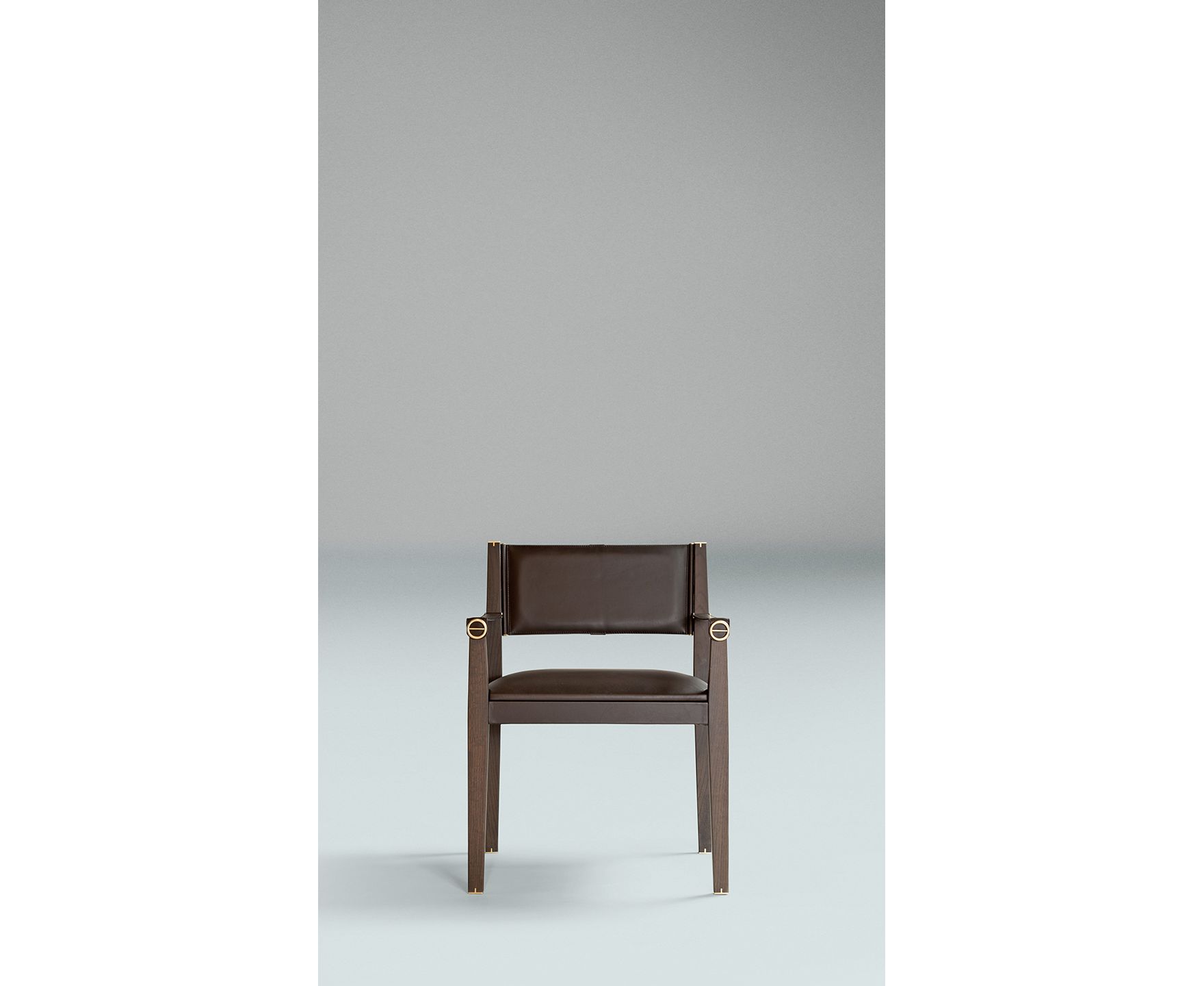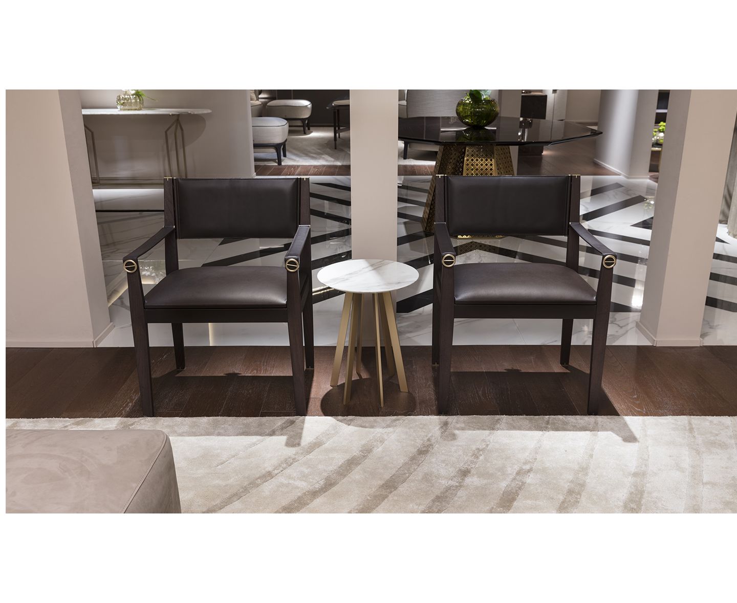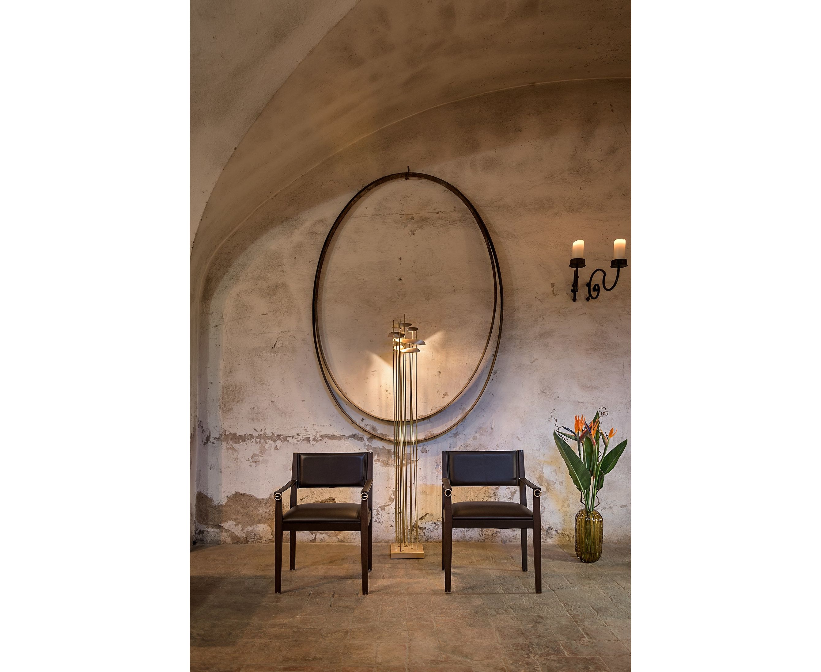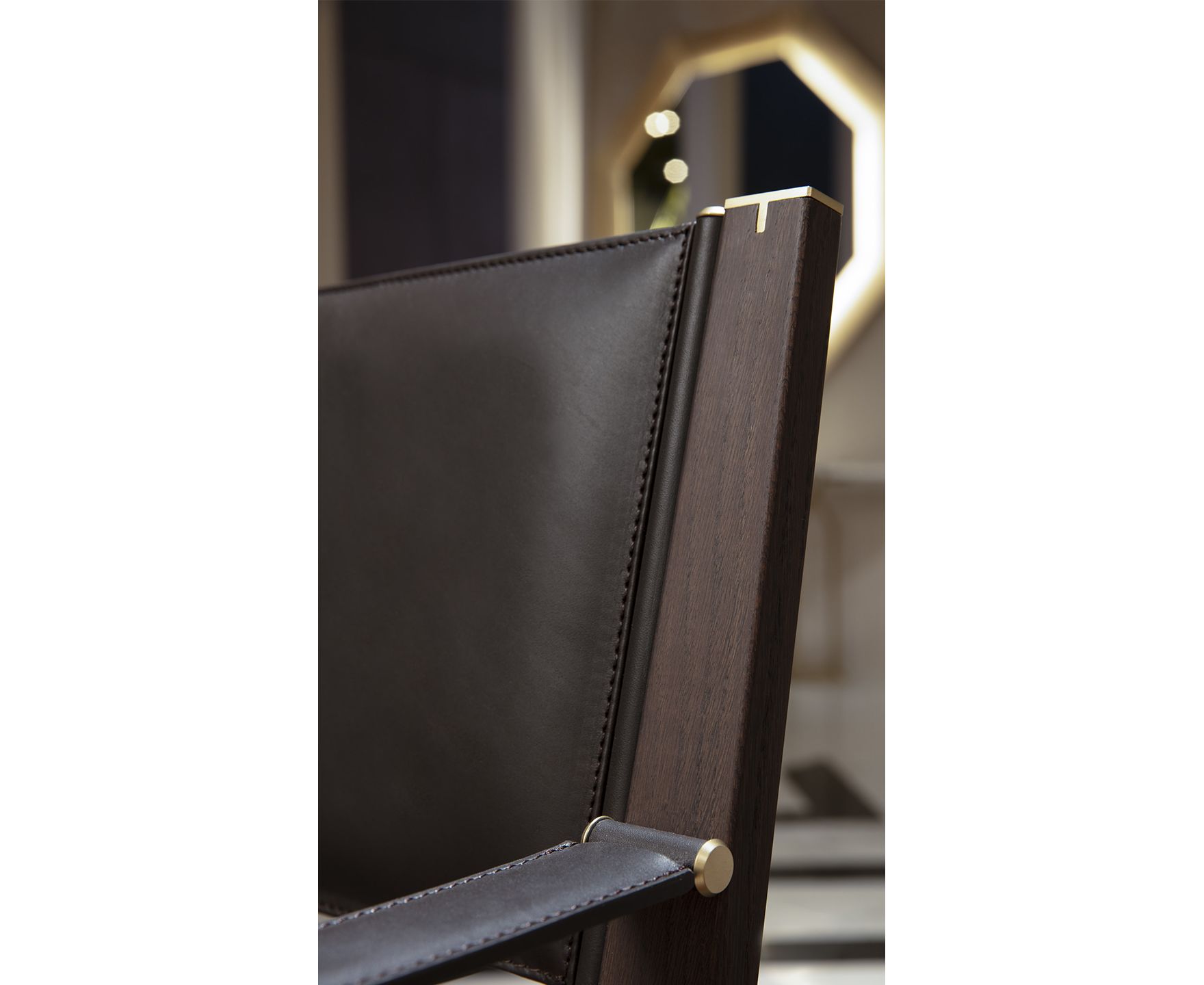 Мультиматерчатый стул с ароматом экзотических путешествий в поисках утраченного Эдема. Вдохновленные колониальным стилем, спинка и сиденье обтянуты кожей, а утонченность работы конструкции из темного мореного дуба подчеркивается хроматическим и материальным контрастом драгоценных вставок из оцинкованного металлического матового золота.