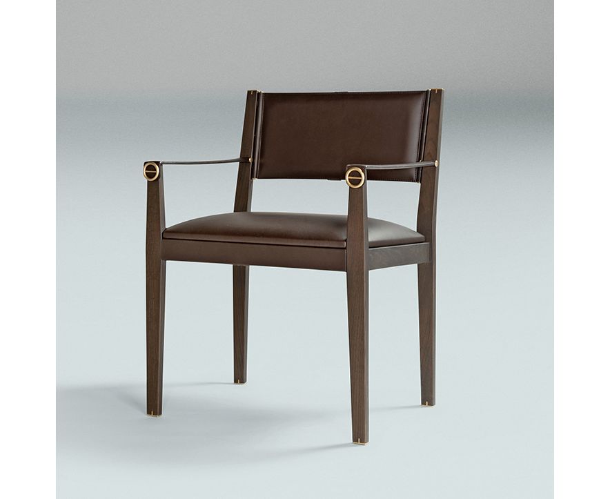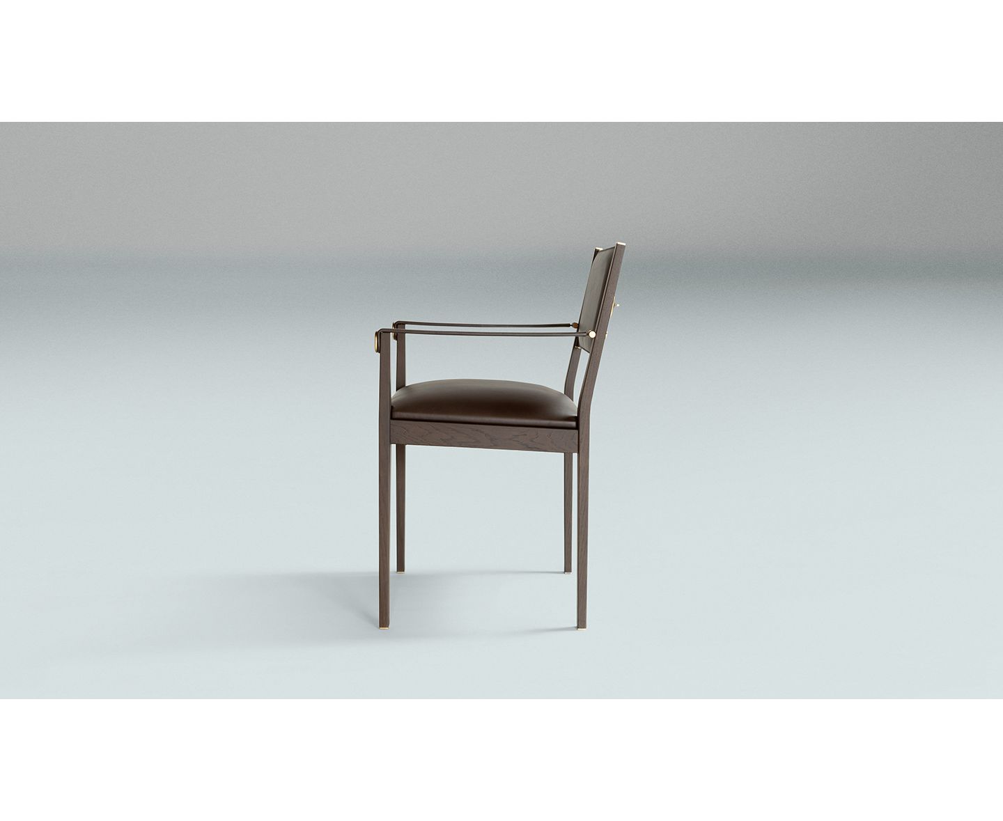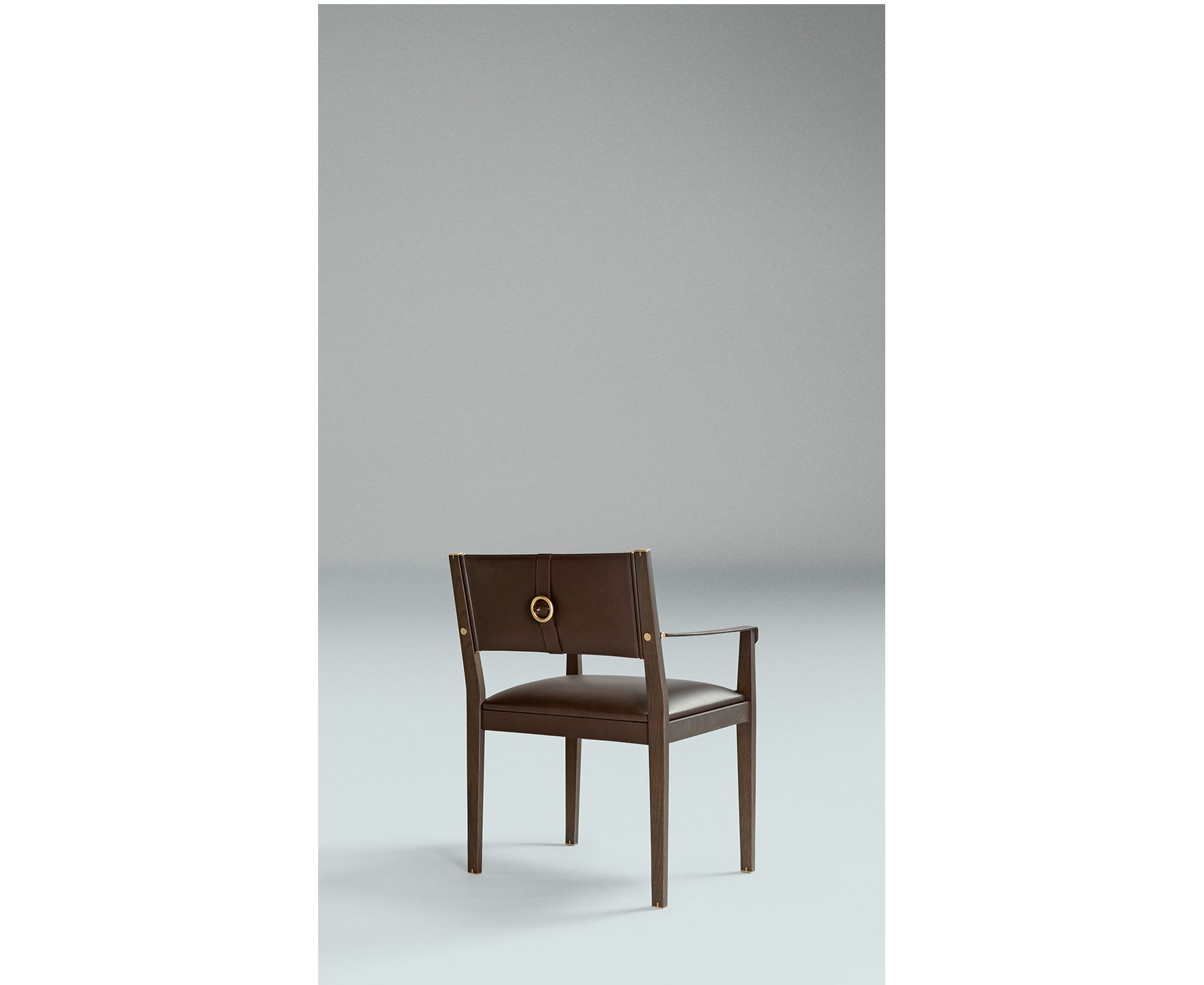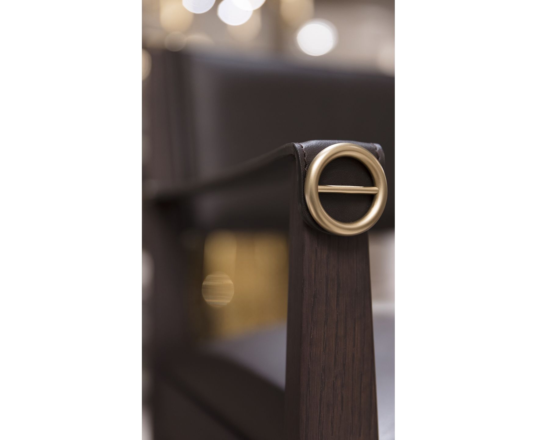 Мультиматерчатый стул с ароматом экзотических путешествий в поисках утраченного Эдема. Вдохновленные колониальным стилем, спинка и сиденье обтянуты кожей, а утонченность работы конструкции из темного мореного дуба подчеркивается хроматическим и материальным контрастом драгоценных вставок из оцинкованного металлического матового золота.