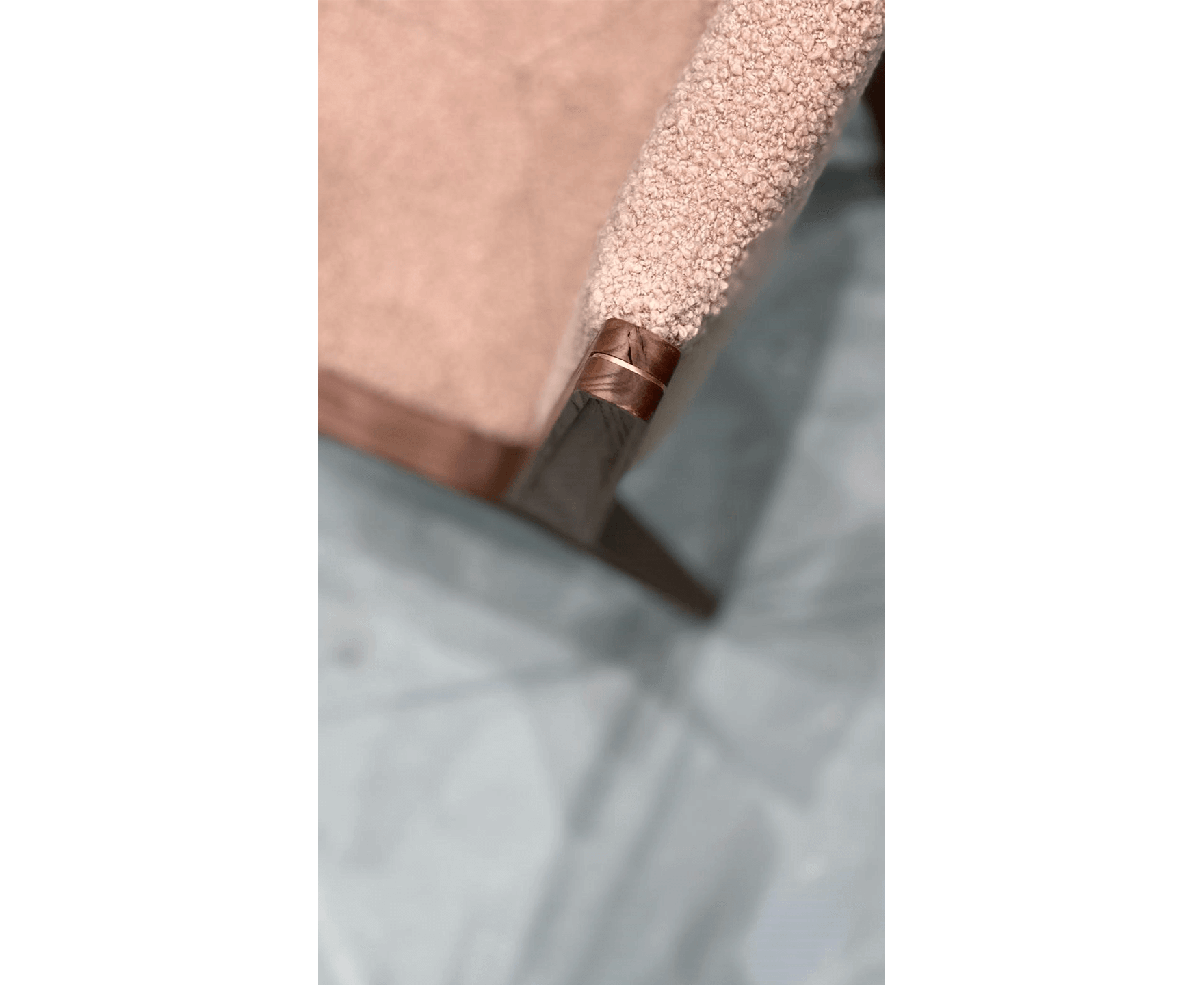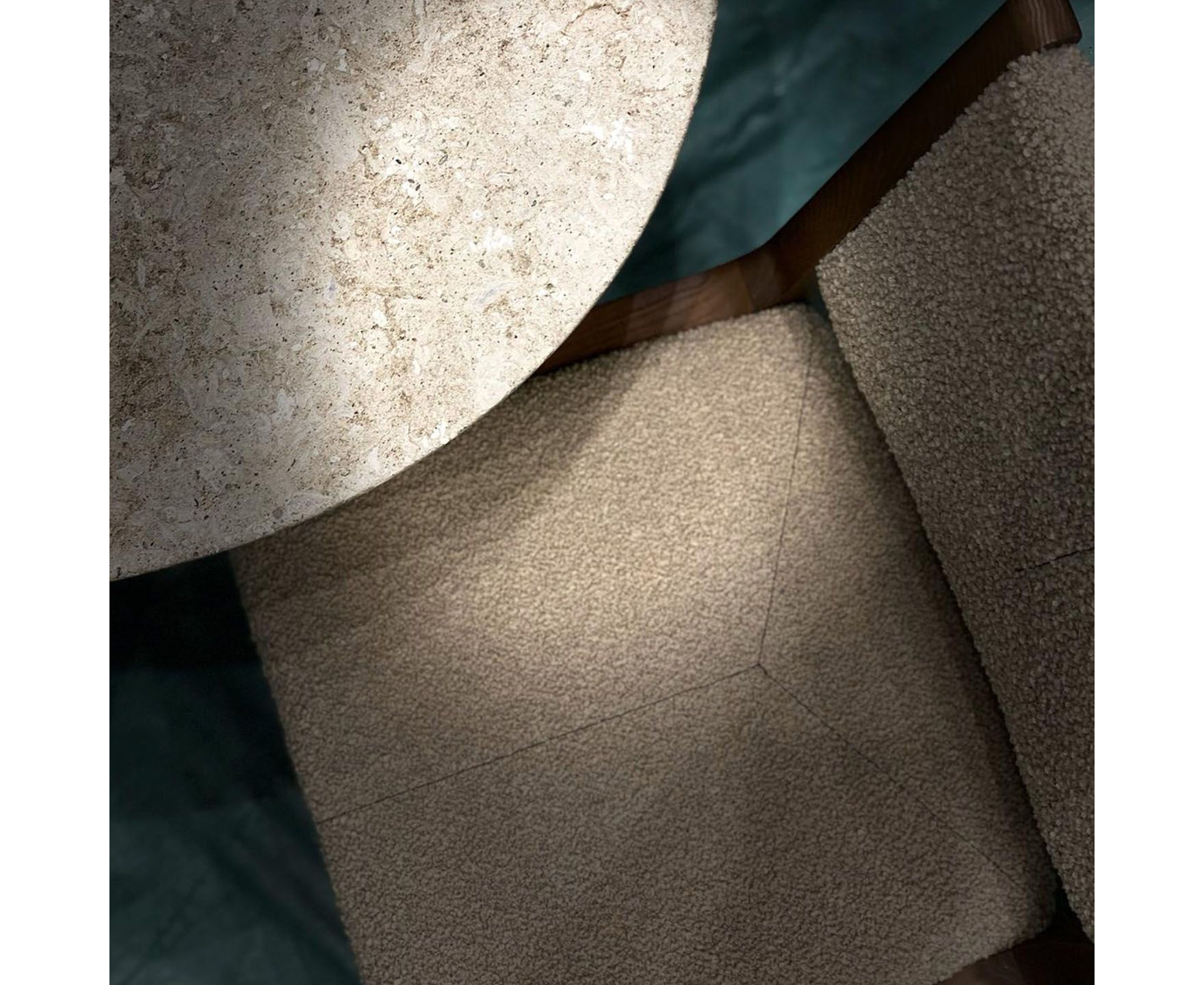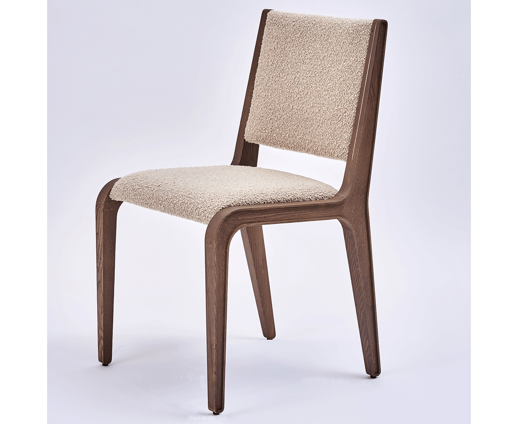 Стул для столовой, полностью изготовленный из экологически чистого ясеня, предлагается в трех вариантах: натуральный ясень с уксусной отделкой, отбеленный или окрашенный в ореховый цвет вариант с отделкой с открытыми порами. Посредством этого процесса поры древесины преднамеренно остаются открытыми, что позволяет шпону сохранять свой естественный вид. Спинка и сиденье покрыты шерстью букле. Детали каркаса из металла цвета шампанского, полированная отделка.