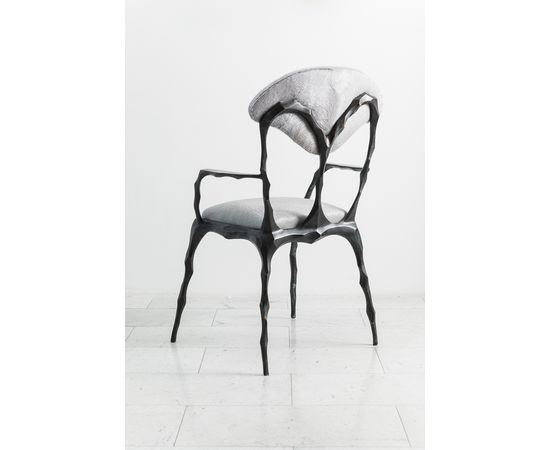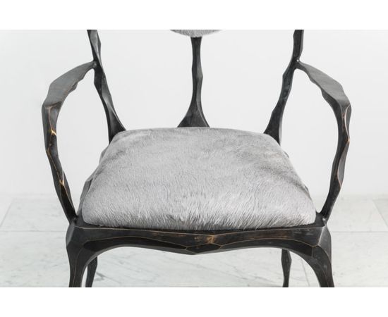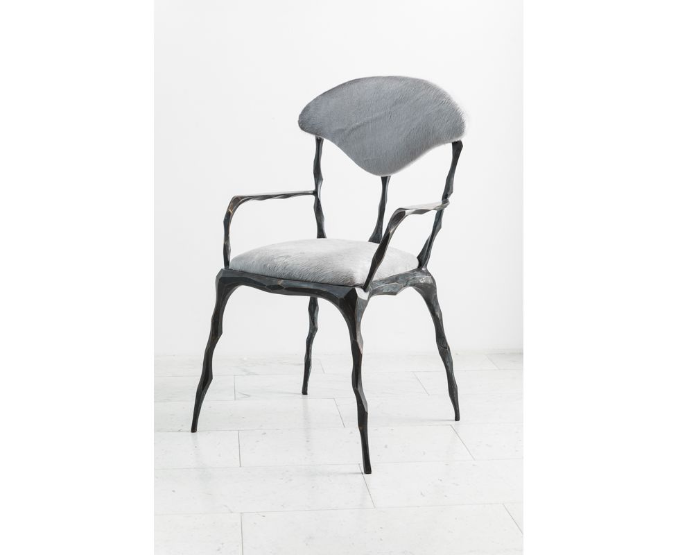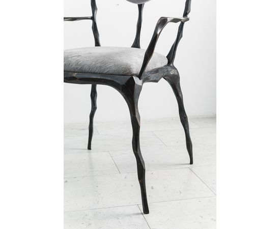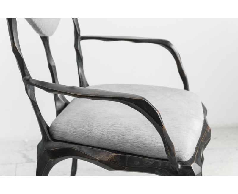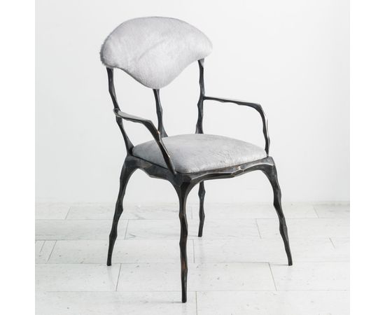 Вдохновленный извилистыми формами органических материалов, Хааз вручную вырезал каждый элемент своего уникального обеденного стула, прежде чем отлить его из полированной бронзы. Бронзовые компоненты выглядят как оживленные волны, столбы дыма или вьющиеся водоросли. Обитое белыми волосами пони кресло может быть обшито множеством материалов. Спинку также можно изготовить из резного дерева ручной работы.