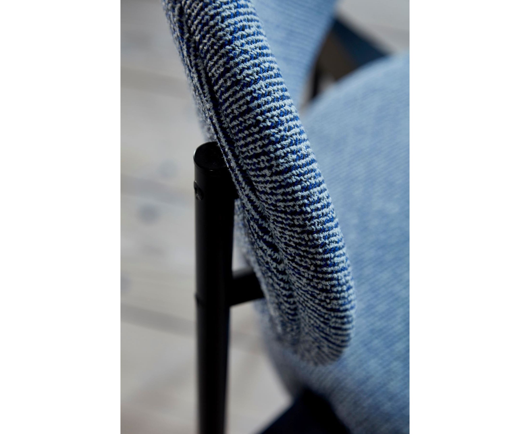 Штабелируемый стул с мягкой обивкой и металлическим каркасом, окрашенный в черный или белый цвет.
