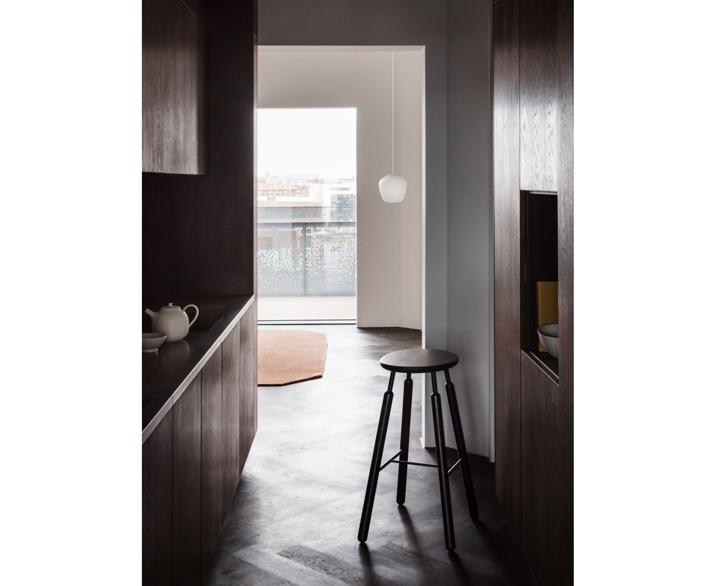 Поверхность ножек стула с пескоструйной обработкой подчеркивает структуру дерева, в то время как тройные ножки имеют игривый вид живого существа в движении. - положение ног допускает два положения для сидения, с одной ногой вперед или двумя. Плоское сиденье также делает стул таким же полезным, как приставной столик.