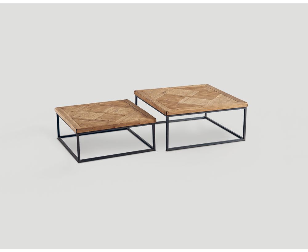 Set di 2 tavolini quadrati sovrapponibili, struttura in metallo finitura Ferro Brunito, top a quadrotta in legno vecchio riciclato finitura Naturale