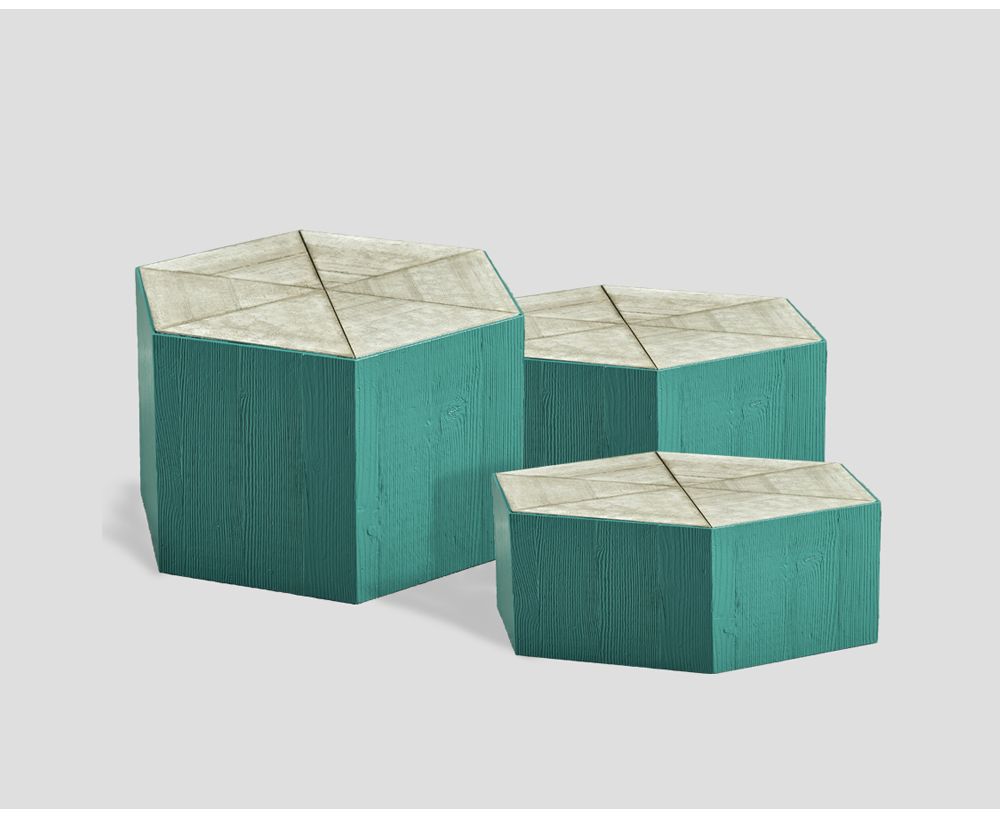Set di 3 tavolini esagonali, in legno vecchio riciclato finitura laccata e cerata a pennello color Verde Smeraldo, top in cemento.
