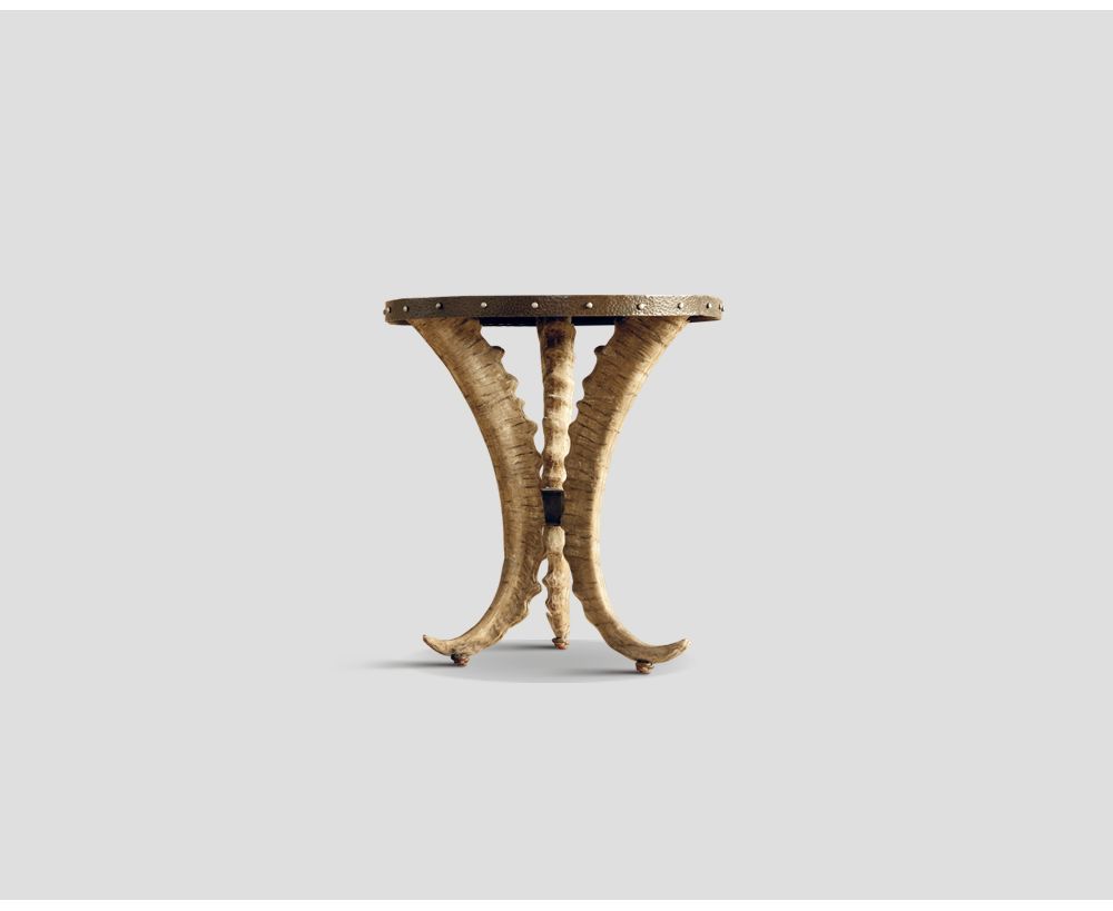 Tavolino tondo in resina naturale con top in metallo martellinato con borchie