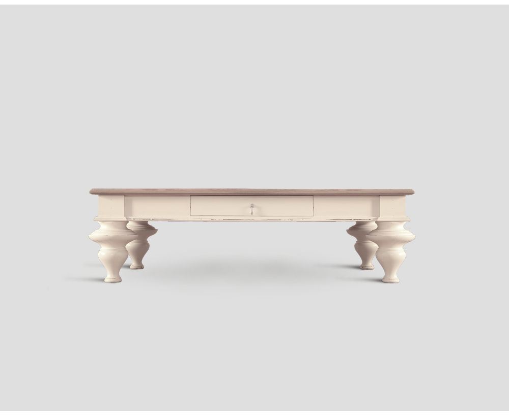 Tavolino rettangolare con 1 cassetto, in legno finitura laccata Bianco Vissuto, top in rovere finitura Vintage Chiaro