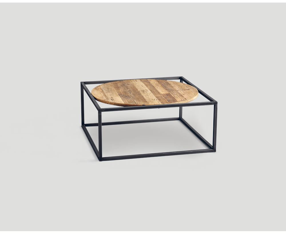 Tavolino quadrato con struttura in metallo finitura Ferro Brunito, top tondo in legno vecchio riciclato finitura Naturale