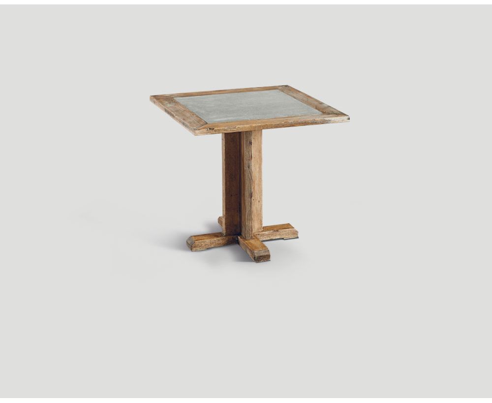 Tavolo quadrato in legno vecchio riciclato con base a croce, top con inserto effetto cemento