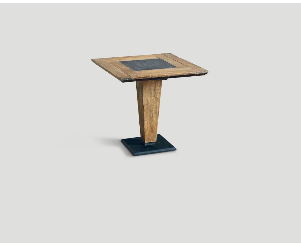 Tavolo quadrato in legno vecchio riciclato con base a cono, top con inserto in marmo Blue Stone