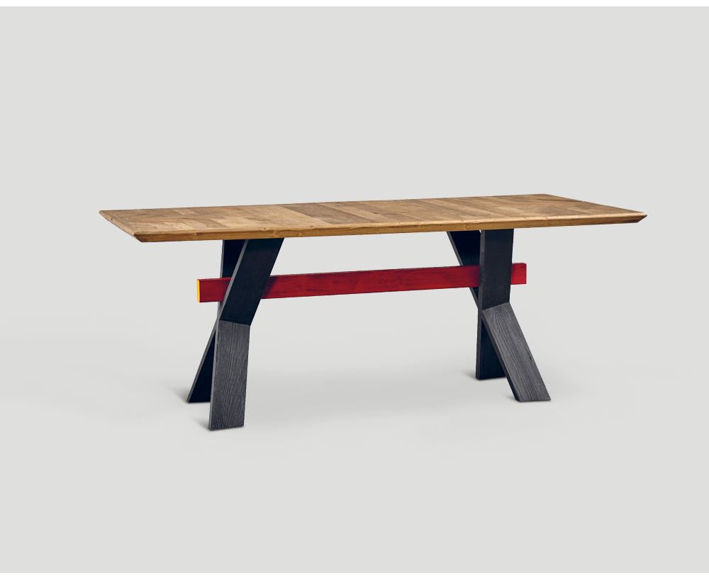 Tavolo rettangolare in legno vecchio riciclato, base laccata e cerata a pennello color Lavagna con traversa Rossa, top a spina di pesce geometrica, finitura Naturale
