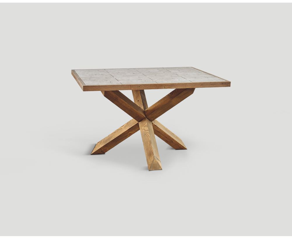 Tavolo quadrato in legno vecchio riciclato, base finitura Naturale, top in cemento design puzzle.