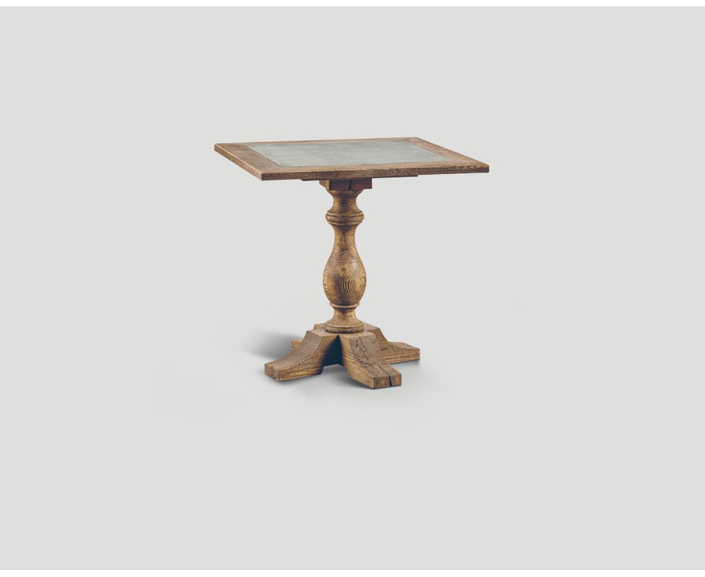 Tavolo quadrato in legno vecchio riciclato con base tornita, top con inserto effetto cemento