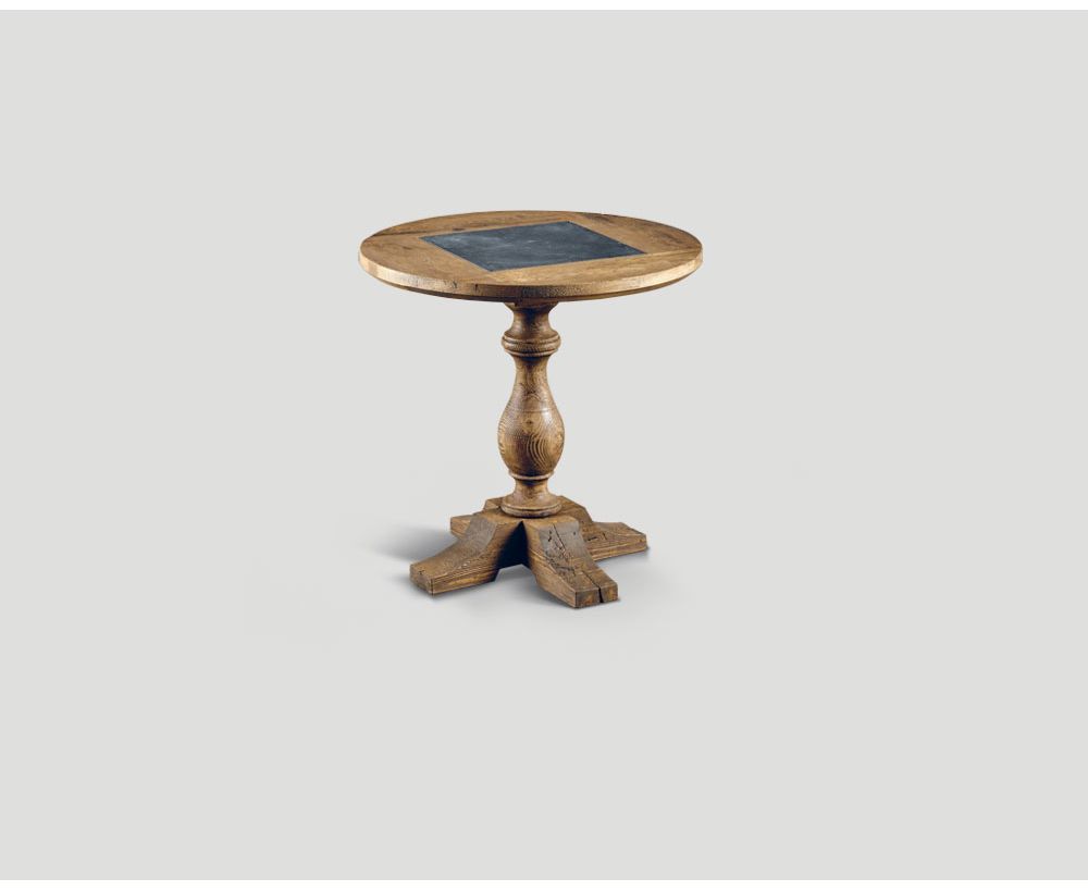 Tavolo tondo in legno vecchio riciclato con base tornita, top con inserto in marmo Blue Stone