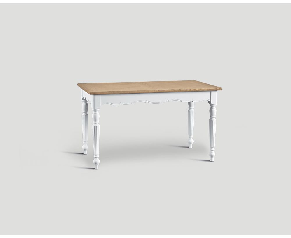 Tavolo rettangolare allungabile con base laccata Bianco Vissuto. Top in rovere finitura Vintage Chiaro.