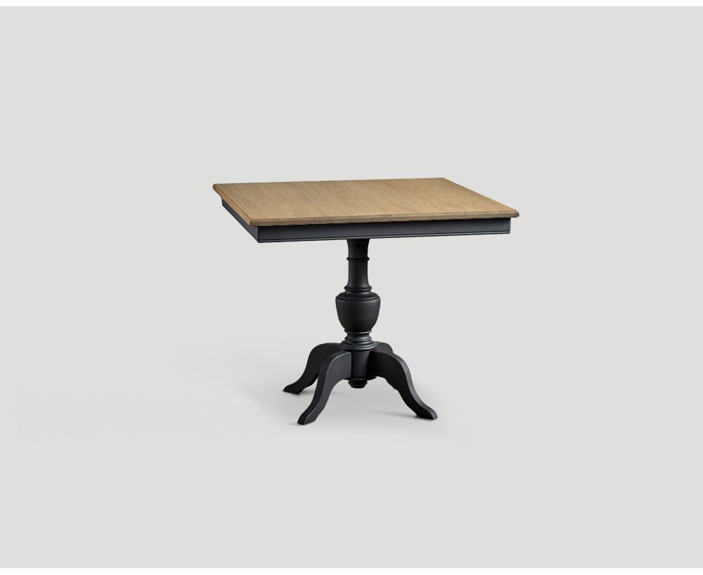 Tavolo quadrato con top in rovere finitura Vintage Chiaro. Base laccata e cerata a pennello color Lavagna