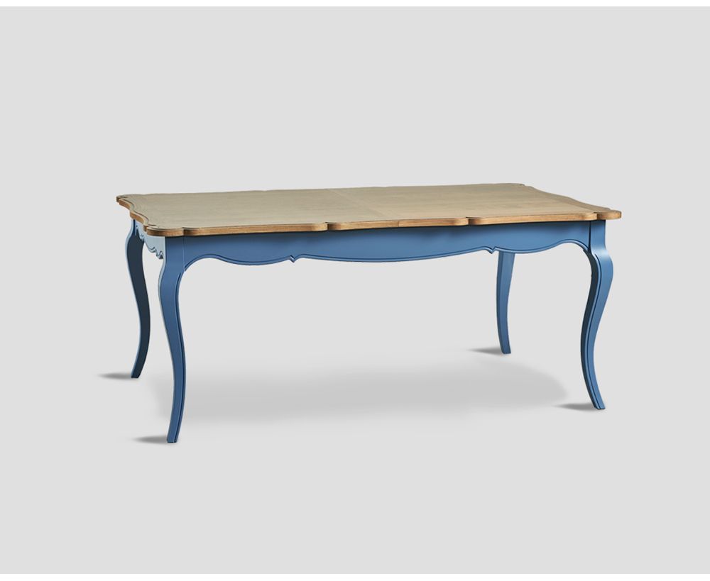 Tavolo rettangolare allungabile con base laccata Blu Jeans, top sagomato in rovere finitura Vintage Chiaro.
