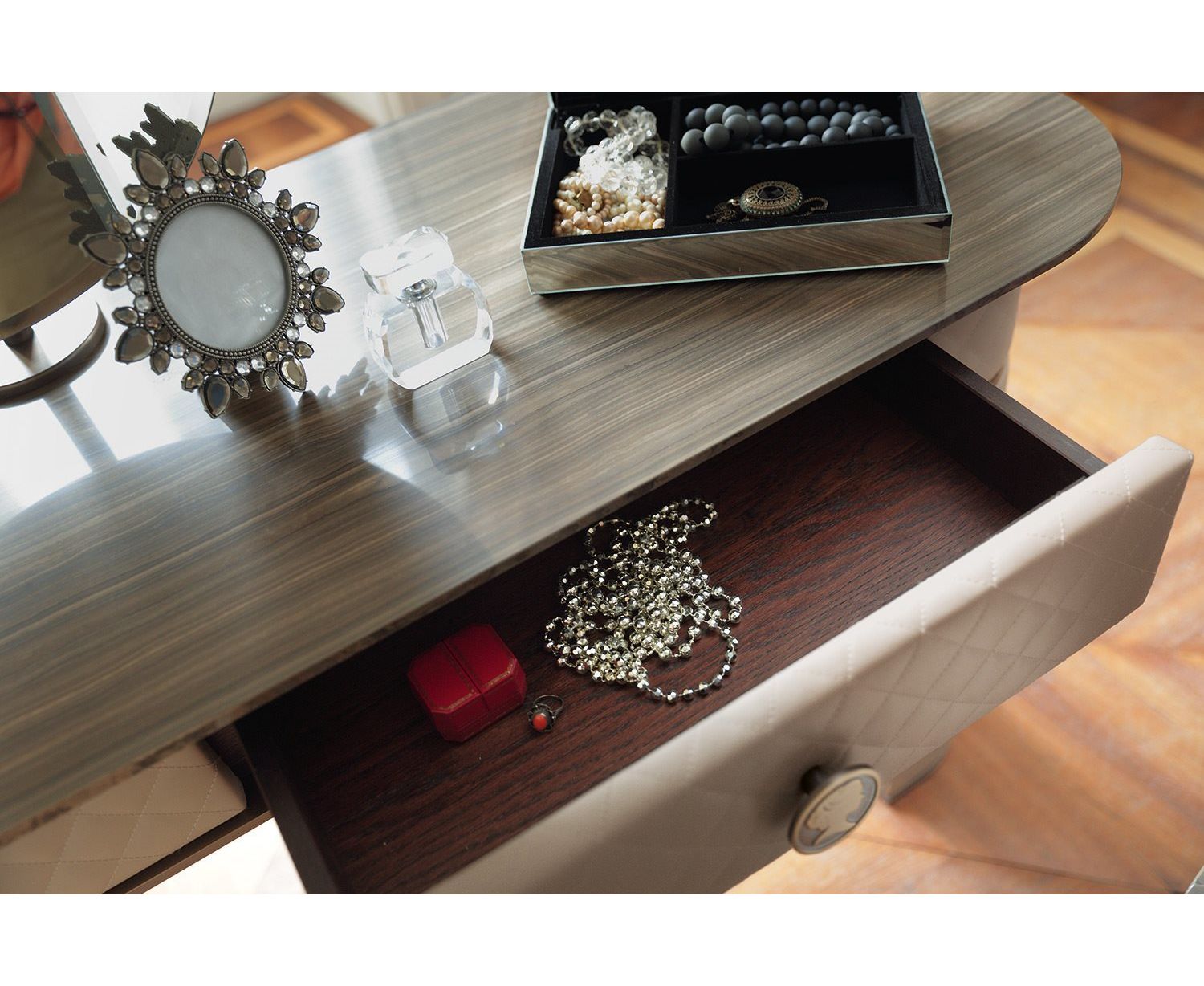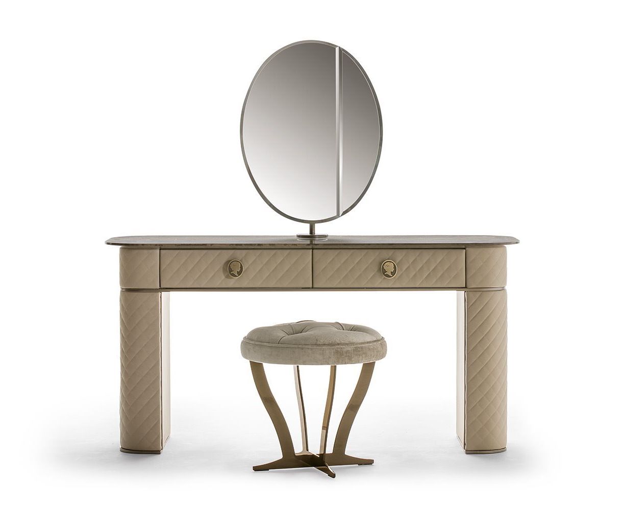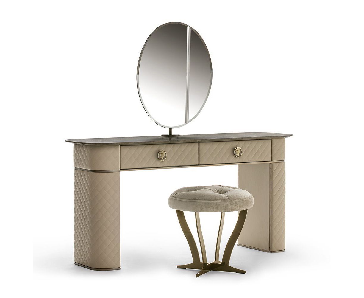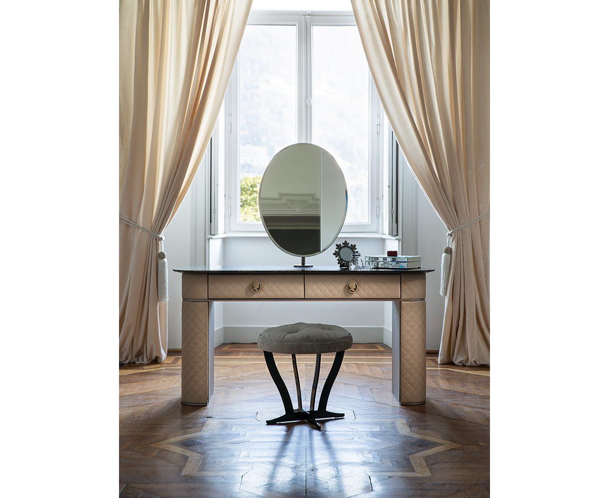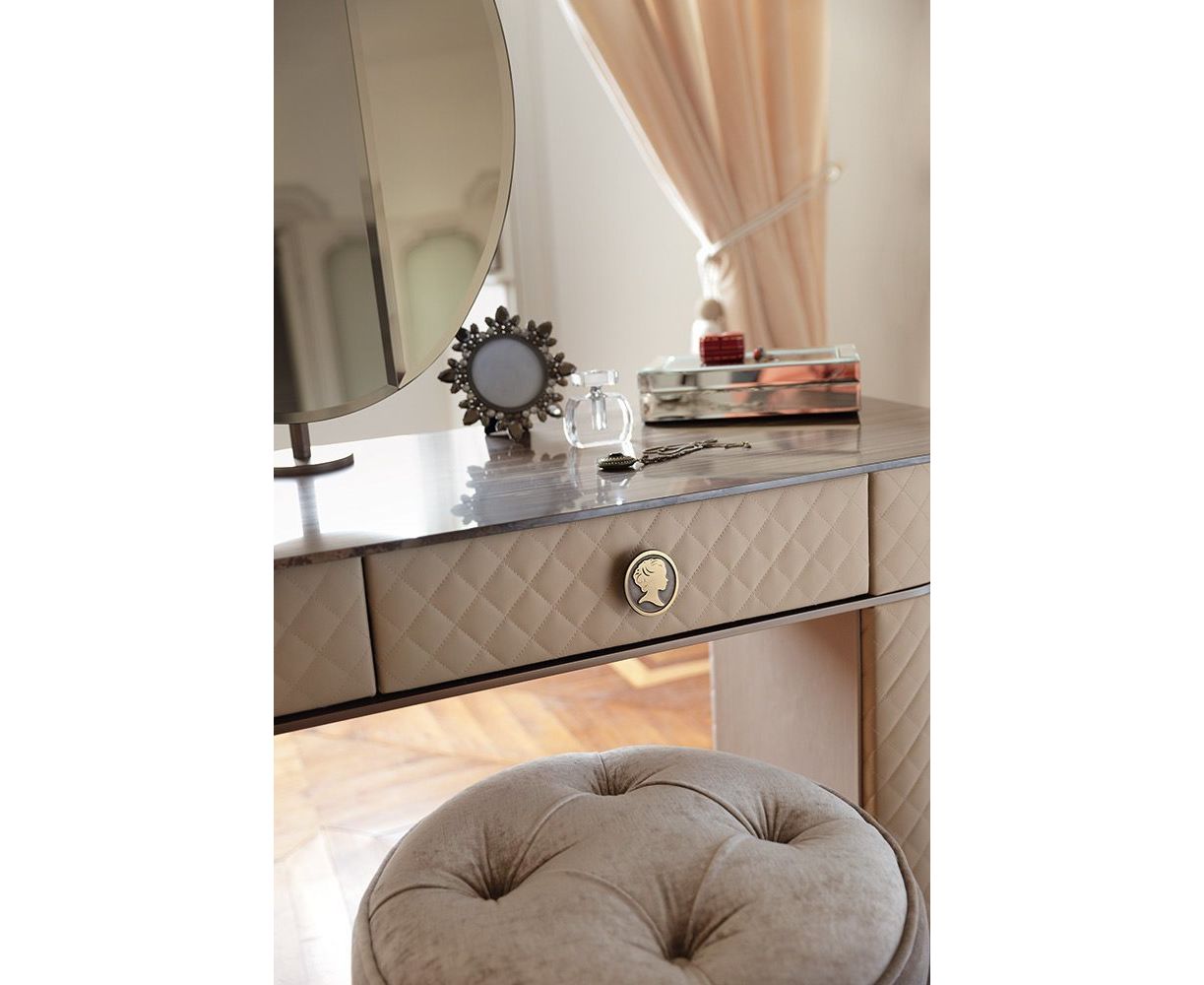 Спальня Controluce дополняется прекрасным туалетным столиком, обтянутым стеганой кожей, с неподвластным времени романтичным видом. Регулируемое зеркало и ручки с камеей придают этому предмету мебели очаровательное прикосновение гламура.
